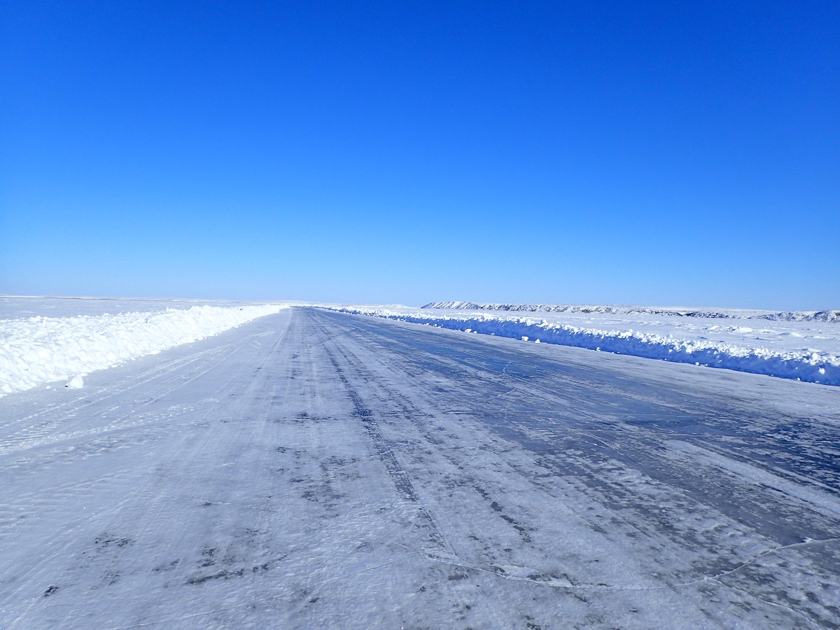 太陽が地平線すれすれになると雪原がピンク色になる。夜のうち、あと数時間でフィニッシュするためアイスロードを見るのはこれで最後(正確には帰りに車で同じ道を通るが)。ここまで見たかった景色を見てこれて本当に来てよかったなと思う。しかも来年からアイスロードはなくなってしまうという最後の年に全コースたどれたのは良かった。この景色がなくなってしまうのは寂しい。ピンク色の景色の中を進んでいるとドローンが飛んできて私を撮影している(笑)取材チームが近くにいるようだ。完全に日が沈んで最後の夜。制限時間的にも問題はなく午前4時くらいにタクトヤクタックにフィニッシュできるだろう。遠くに明らかに人工の明かりが見えるようになった。横一列に光が見えて左から右へ動いているように見えるのだが気のせいだろうか。橋の上を車の列が通行しているように見えている。街の明かりが見えたことで自然に急ぎ足になる。