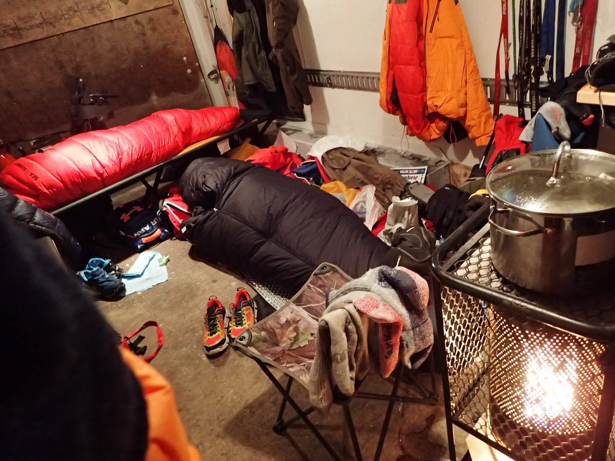 トレーラーに入ると選手2人仮眠中。1つ前のCPイヌビックで同じコテージの部屋を割り当てられていた選手だ。イヌビックでは私が寝る前に出ていったから5時間以上差があったはず。ここでまだ寝ているということは差を詰めてきたかもしれない。軽く食事をし少しでも乾かしたいウェアをストーブの周りに並べてトレーラーの床にシュラフを広げてもぐりこむ。トレーラーの中はがんがんストーブが燃えているが床はそれなりに寒い。ちなみにトレーラーの外壁もキンキンに冷えているためウェアを壁際に干すと、ストーブの熱にあたる室内側は乾いてくるが、外壁に触れた部分は凍ってしまう。少し寝た後トイレに出てトレーラーに戻ると寝ていた選手が起きて出発の準備をしている。1つだけ簡易ベッド(キャンプ用ベンチみたいな感じ)がありそれが空いたので、そこで寝るように勧めてくれた。ありがたい、これで冷えを感じずに寝れる。6時半に目を覚まし動けそうな感じがしたため「7時に出発しよう!」と思ったが、ふと気が付くと9時45分!?何が起きたのかわからないくらいで3時間以上経過してしまった。盛大な2度寝。寝心地のいいベッドを譲られたのが悪いほうに出たか?飛び起きて出発の準備。荷物をソリに放り込んで朝食も取らずに10時15分出発。