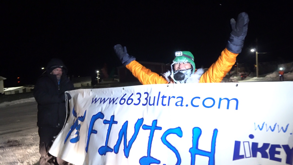 光の列は消えて建物らしい影の形が浮かび上がってきた。本当に到着したらしい!建物がはっきり目の前に見えてきてゆっくり走る車が現れた。大会スタッフの車がフィニッシュラインまで先導してくれる。3年分の重みを感じながら、何が何でも完走とこれまで走ってきて、フィニッシュに来たら泣くかと思っていたが、いざ来てみるとそんなことはなく「うわー、ほんとうに北極海まで来ちゃったよ!」(ただしいまいち実感なし)という感じだった。ただ最後の一歩一歩を味わうように歩いた。最後に少し下りがあったので小走りに。道の先のほうで出迎えてくれる人たちが見えてきた。大会の横断幕が広げられている場所にフィニッシュ。やりきった!という気持ちよさと、もう極寒レースをクリアしたのでやらなくてもいいんだという呪縛から解き放たれた解放感!フィニッシュの時間は4時32分。制限時間まであと4時間30分を残してのフィニッシュ。ぎりぎりとも言う。ちなみに予定に対して1時間7分遅れ、予定に時差は加味していなかったので実質は予定よりも53分早くフィニッシュした。レース中通しておおよそ予定(見積もり)通りに行ったのは偶然かもしれないがよくまとまったと思う。