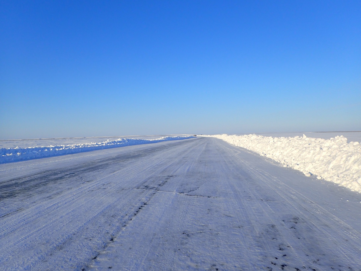 日が傾いてくると今日も急激に冷え込んできた。風も少しあるので風に背を向けてソックスを変えたりグローブを変えたりする。グローブはこれまでは緊急用として使わなかったダウンミトンを使ってみる。さすがにメリノウールのトリガーミトンよりも断然暖かい。残りの距離はまもなく残り30kmくらいか?というところに来ていてフィニッシュへのカウントダウン。それでも念には念を入れて自分の体を少しでも快適に保つ。一時停止したすぐそばにポールの先端にパネルのようなものがついたものが数本立っていた。なんだかよくわからないが日本の道路だったら峠道のカーブとかにある反射板のようなサイズ感(まわりの風景が広大だから小さく見えている可能性あり)。何もないところで人工物を見つけるとそれ以外に何もなくてももうすぐ街がある?とか気持ちがうきうきしてしまうから不思議だ。それを過ぎるとこれまでにも増してまっ平らで何もない感になった。遠くにも山や丘のような起伏がまったく見えない。(後日談。このあたりで北極海に出たらしい)