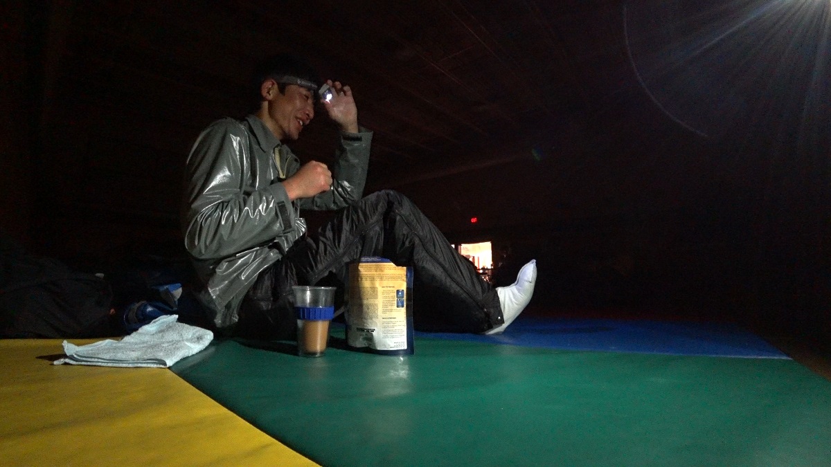 フィニッシュして少しインタビューに応えているとマーティンが選手待機場所に車で送ると言う。もう少しのんびりこの場にいたい気もしたが体が冷えたらまずいし、スタッフたちも次の選手が来るまでは暖かくして休む必要があるだろう。次の選手がいつ来るのかをどうやって知るのかはいまだに謎だが。待機場所は学校で寝る場所は体育館。松村さんが場所とマットを確保しておいてくれた。さらに大会スタッフの方がフリーズドライの食べ物と暖かい飲み物を用意してくれたので、体育館のマットに座って食事をしながら松村さんとレースについて話をする。もう急がなくていいのが素晴らしい。たぶん疲れているはずだけど特に眠いとか横になりたいとかは思わなかった。