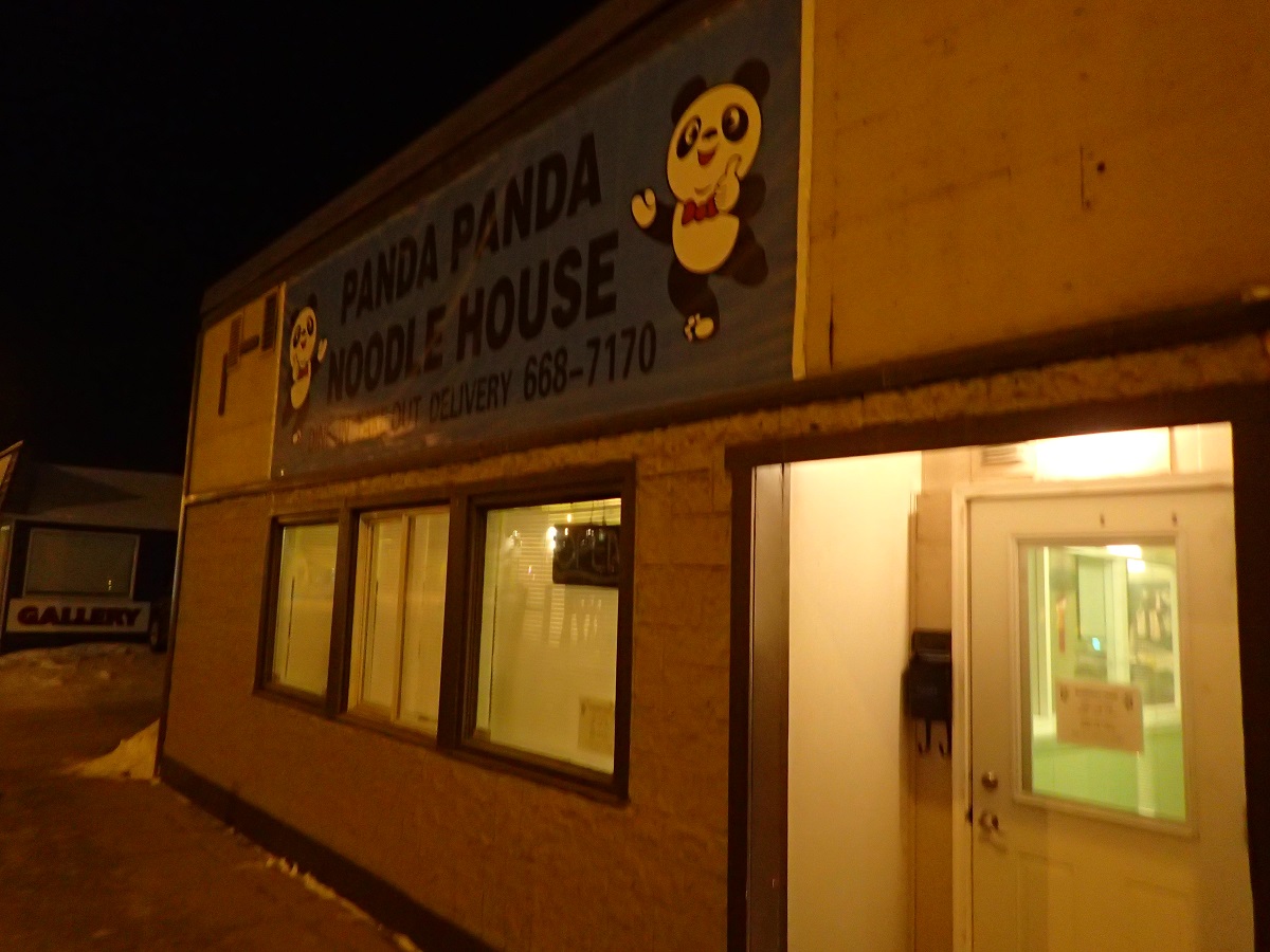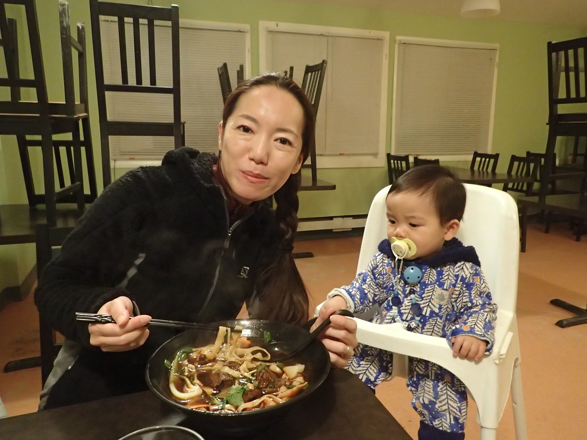 ホテルに戻ってソリをチェックすると車輪を固定するナットが取れて紛失していた。輸送するときにばらしたり組み立てたりする部分なので念のため予備のボルトとナットをいくつも購入してあるので問題はないがたかが数キロで紛失してしまうのはちょっとまずい。新しいナットを力を込めて占める。夕食は昨日まで宿泊していたモーテルのそばにある「パンダパンダ」というヌードル屋へ。怪しいたたずまいでいままではパンダパンダに行くくらいならマクドナルドへという感じだった。閉店40分前(21:30終了のところ20:50)で店員さんはお店のかたずけをしながらめんどくさそうな対応。でもOKだというのでメニューを見せてもらい店員さんお勧めのワンタンメンを注文。お料理が出てくるのを待つ間にもお店の閉店準備が進み、周りのテーブルの上に椅子が積み上げられていきます。しばらくして麺登場。すごくおいしい!(特に麺よりも具が)れなっちは別のメニューを頼んだので少し交換して食べてみたがどちらもうまい。パンダパンダなかなかやるな!れなっちは明日もパンダパンダに行くことにしたらしい。