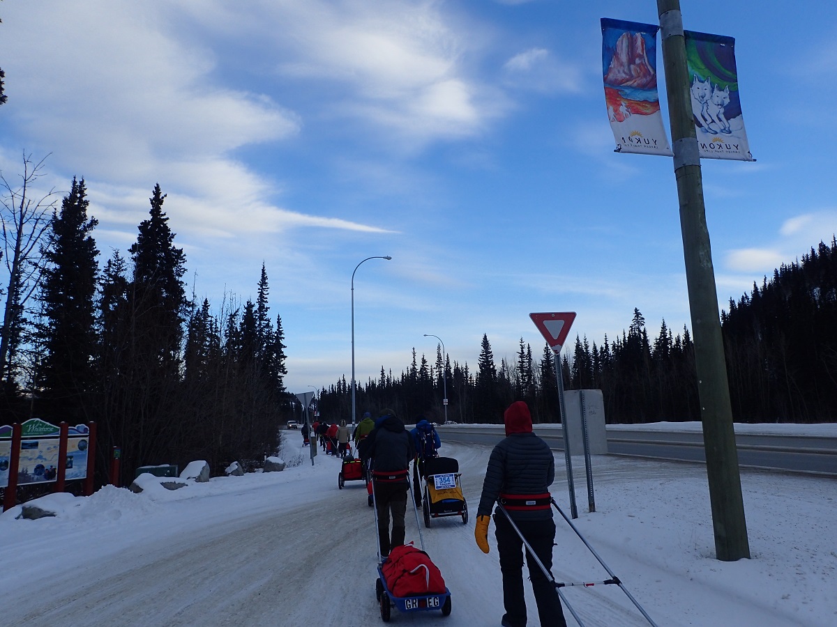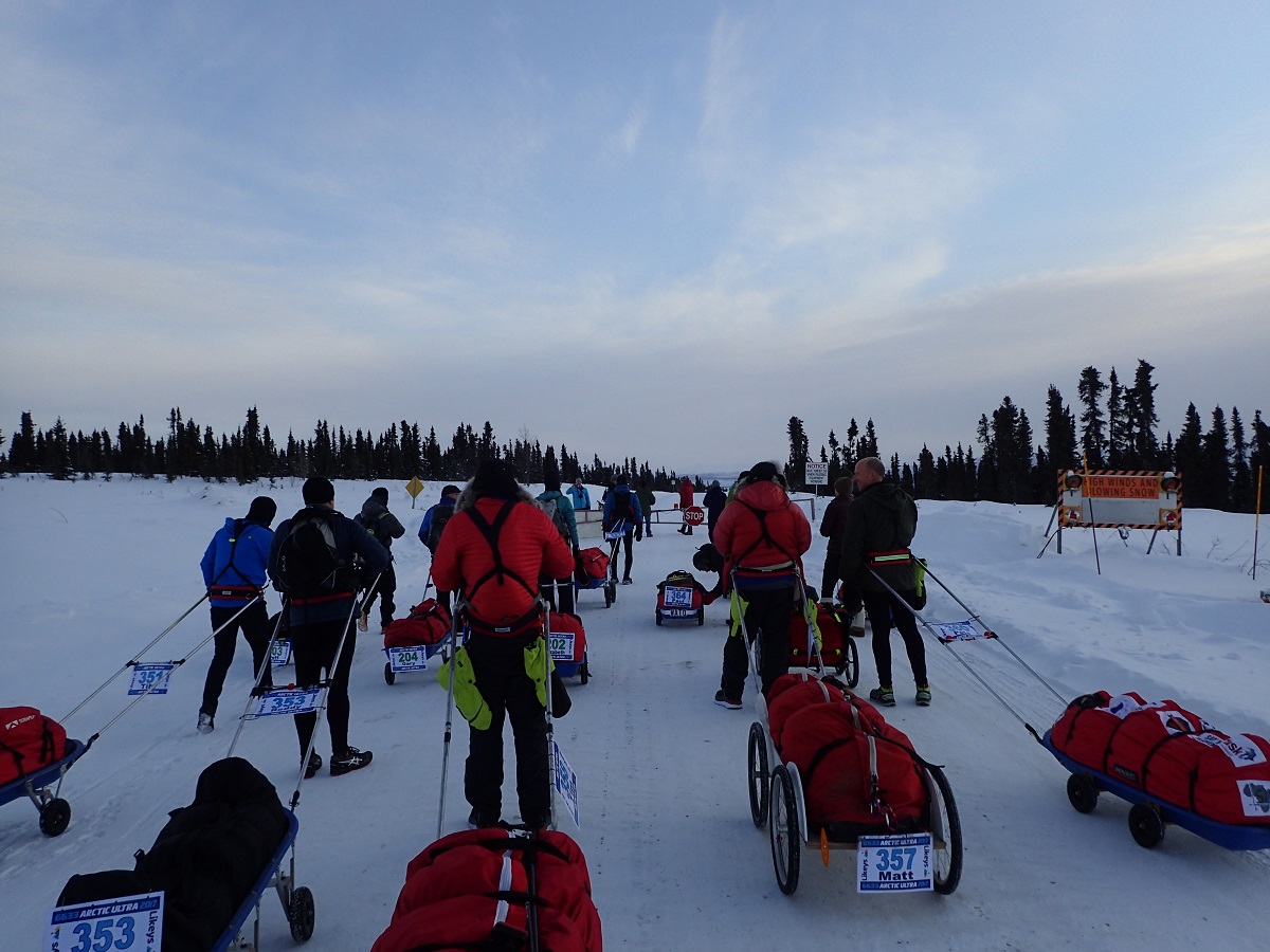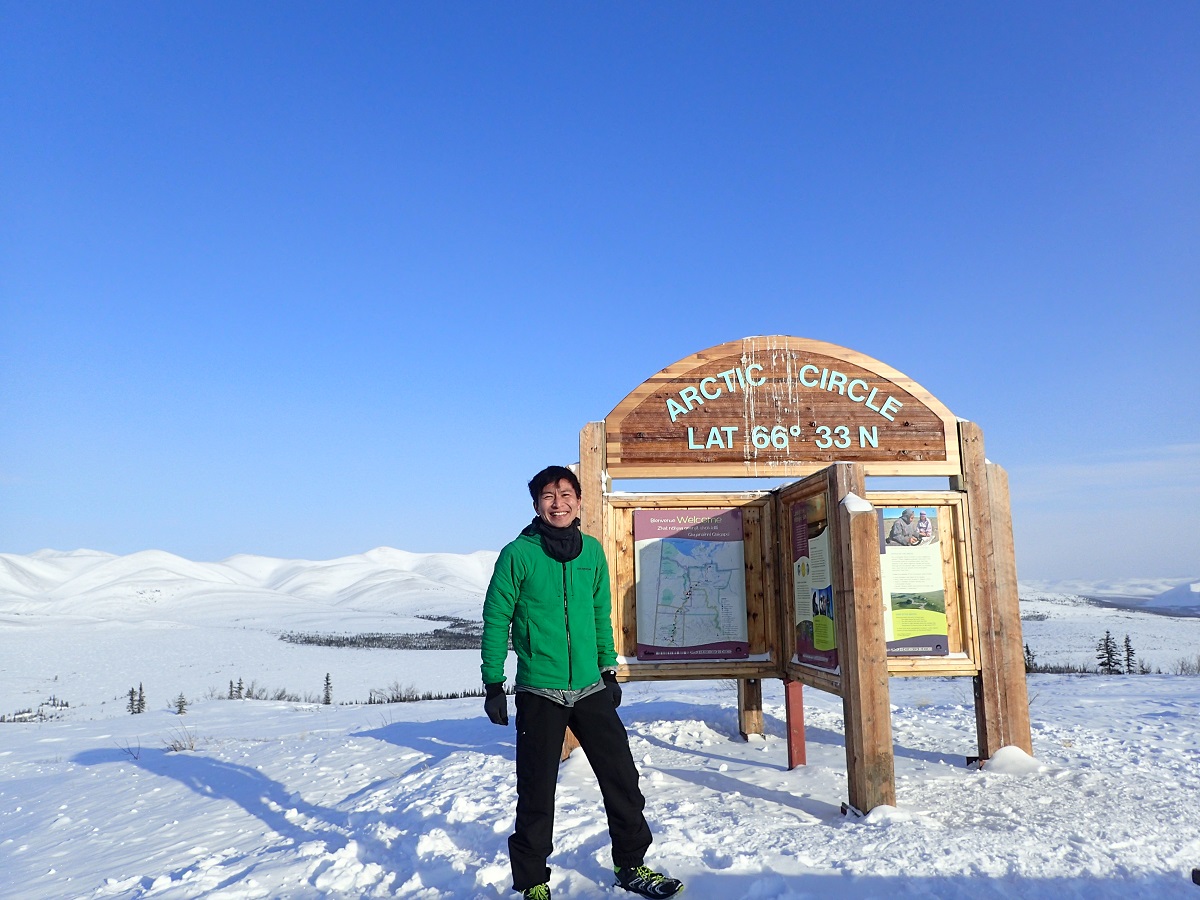レースのフィニッシュ関門は8日後。ただしユーコン準州からノースウエスト準州に入るときに時差+1時間さらにサマータイムで+1時間されるため、実際には7日と22時間が制限時間になる。スタートするとまずは長い下り坂。トップに1人飛び出した選手がいて、それを追いかける松村さん。松村さんは撮影のためにトップを追いかけているのかと思ったら、どんどん突っ走ってトップ2人で視界から消えてしまった。こちらは急がずぼちぼちで。ただこの後に登り返しがくるので登りでがんばらなくていいように下りも特にペースを抑えることはしない。37kmのアークティックサークル(CP1)までは体力が有り余っている想定で時速6kmを予定している。そのためやや薄着でスタートしたがそれでもしっかり汗をかいている。気温はマイナス15度程度なので特別暖かいわけではないが。