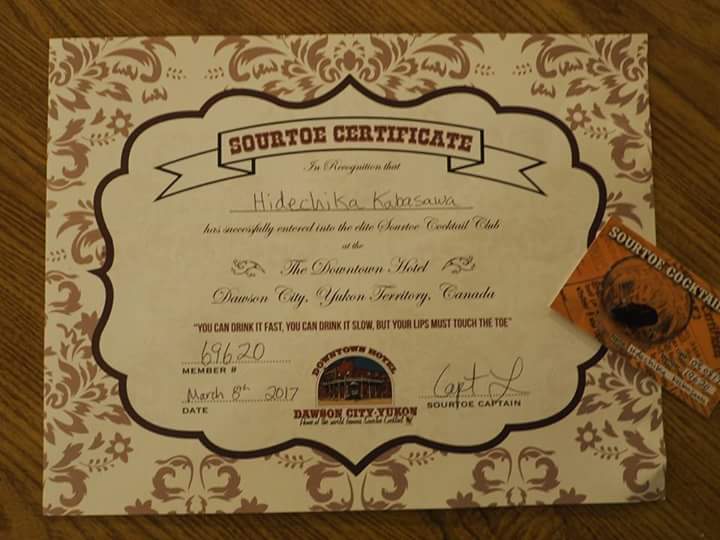 今日は8時起床。9時半トレーラーに荷物積み込み。10時半ホワイトホース出発。550kmのドライブでドーソンシティへ向かう。ブレイバーンロッジで軽いお昼休みがあって17時にドーソンシティに到着。ダウンタウンホテルにチェックインし周辺を散歩。思っていたより普通に街だった。お店はみんな小さいけど。19時半から夕食。そのあとSOURTOE COCKTAILという儀式に参加。ここから北に向かう人が凍傷にならないように、カクテルに沈められた凍傷で切り落とされた指に唇が触れるまで一気飲みするというもの。儀式なのでちゃんとやりましたが、基本的にお酒飲めないのでくらくら。儀式を受けた証明書をもらいました。明日は午前中は少しドーソン散歩する時間もあるかも。それからさらに500km先のイーグルプレインズに移動します。