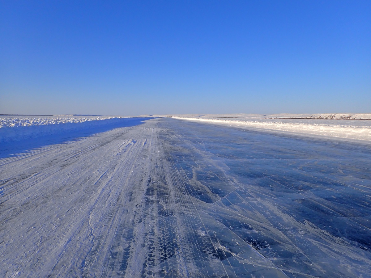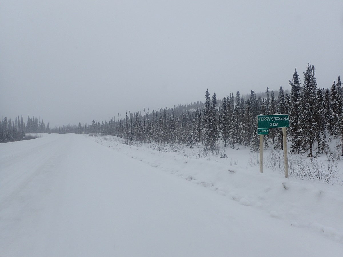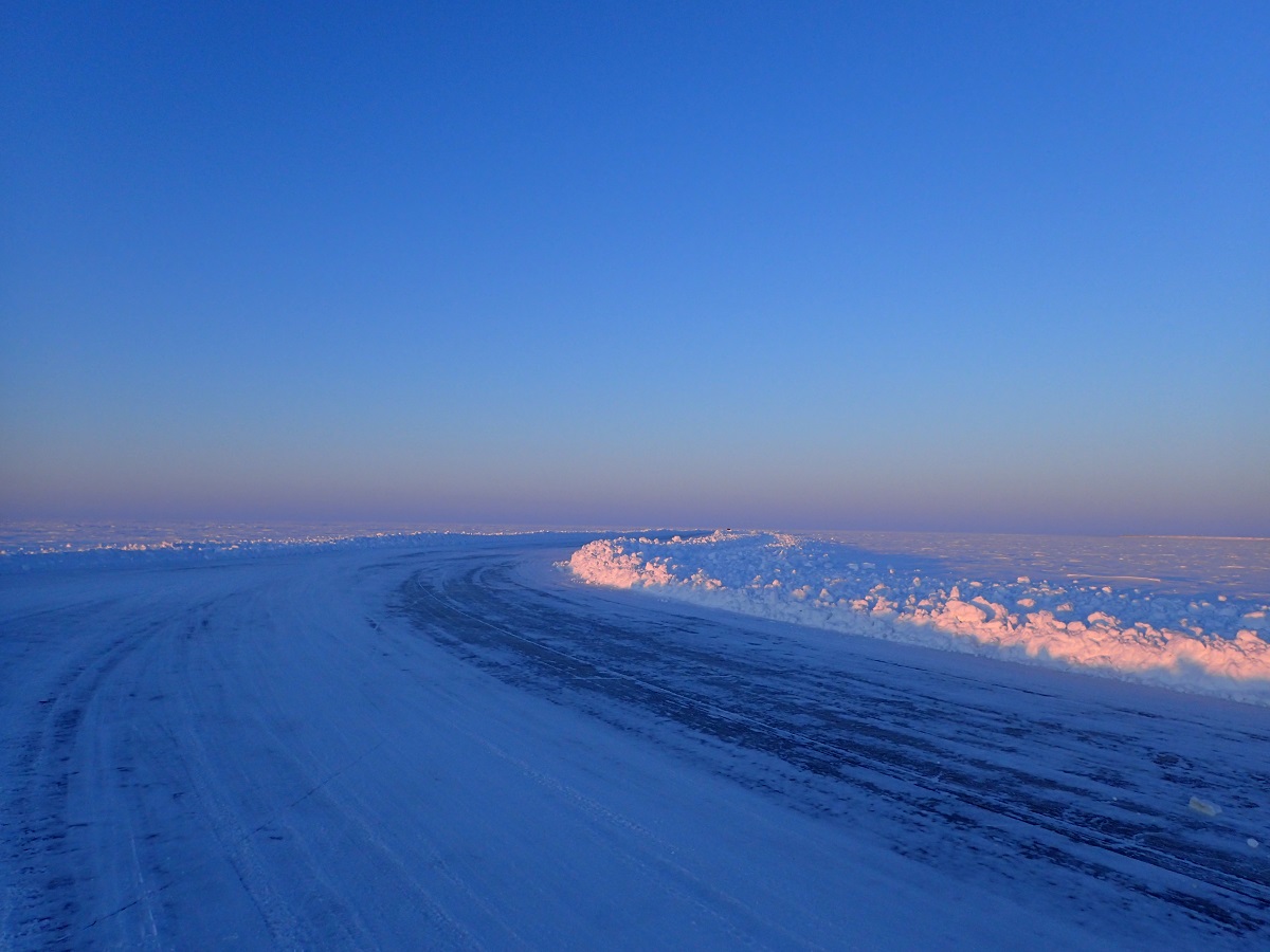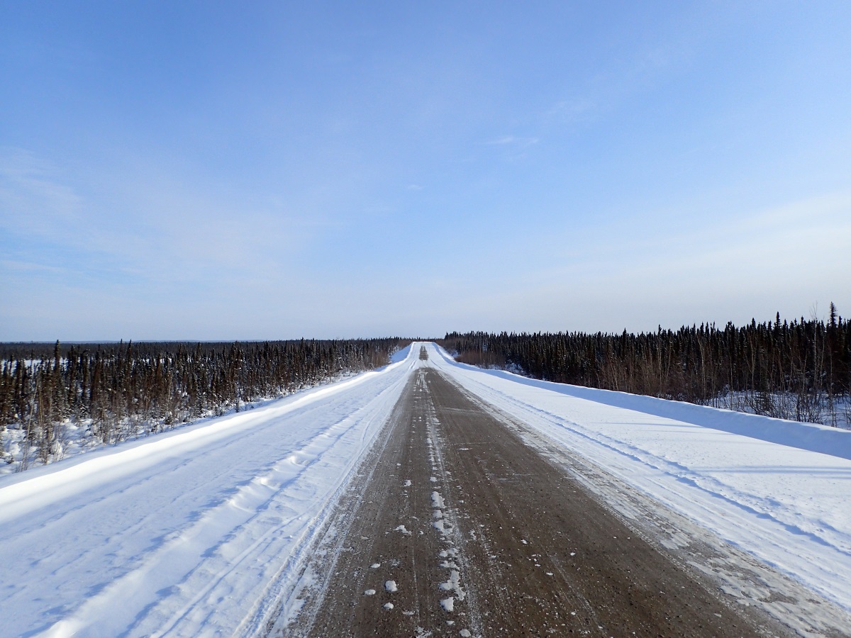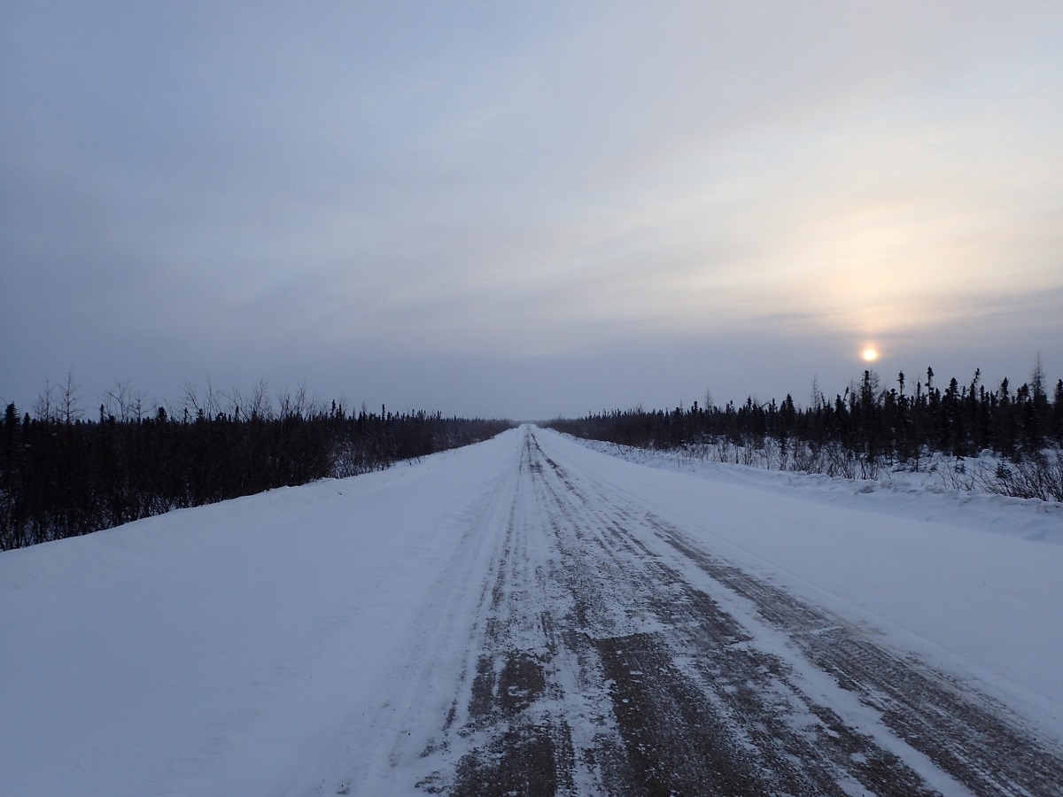 昼頃キャンプサイト?家?のようなものがあるところを通過しフィールリバークロッシングへ。凍った川を渡る。ここを過ぎればフォートマクファーソンももうすぐだ。またここで標高もほぼゼロ。GPSを見ても15mあたりを表示している。つまりここからは山はなくひたすら平地。数十キロで獲得標高が300mとかそんな感じ(その分下って足すと0mになる)。早くフォートマクファーソンに到着したいがここに来てペースダウン。足がむくんで痛いのと眠くて油断すると立ったまま眠ってしまいそう。飛行場があるらしく飛行機が降りてくるような音を聞いた。町はすぐそこのはずなのになかなかつかない。
