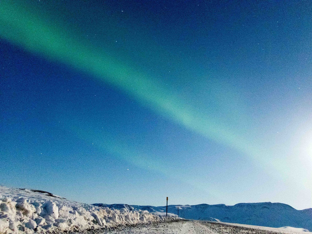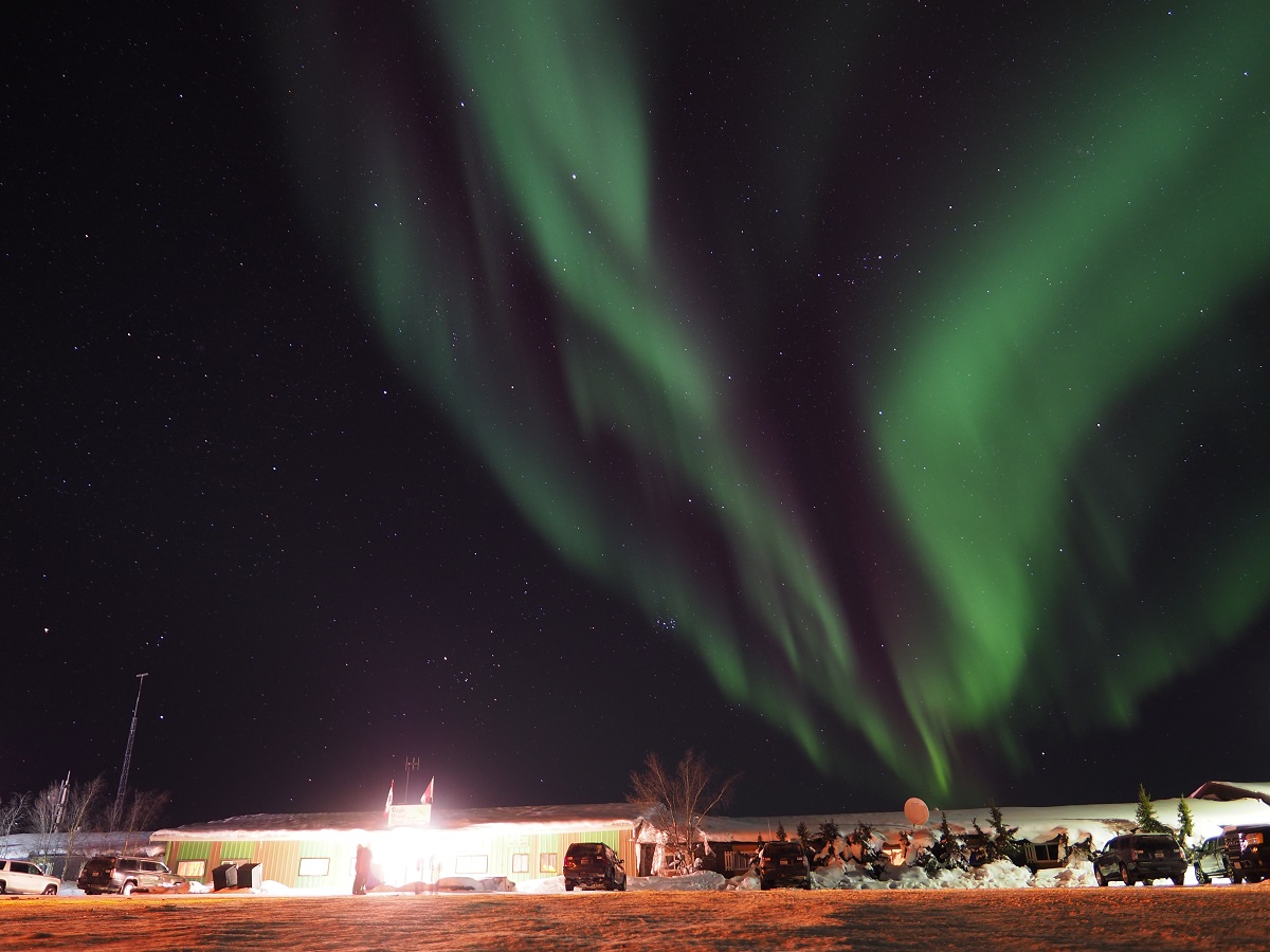 睡眠時間は4時間から寝れるなら6時間くらい寝てしまってもよいと考えていたが、目を覚ますと2時間半しか経っていなかった。しかしすぐにもう一度眠れる感じでもないため食事をしてお湯を入れて出発することにする。CPの停滞時間は約6時間(他の選手に比べてもたついている感)で21時すぎに出発。CPから少し登ると道は沢へ降りて行っている感じ。オーロラが出ていてほぼ満月の月に照らされた山といい感じの景色を作っている。とりあえずオーロラが出ていたという記録を残すためにTG4でオーロラ夜景を数枚撮っておく。道は沢沿いに下っていくのかと思ったら沢を通り越して反対側の山に登っていく。登っていく途中に除雪の重機が置いてあった。ジェームスクリークに向かっているときに除雪している重機もいたし、ジェームズクリークのCPが道路管理基地だったに違いない。後ろからすごい勢いで登ってくる選手がいてあっという間に抜き去られたが、登り切ったところで何かやっているのを抜かし返した。