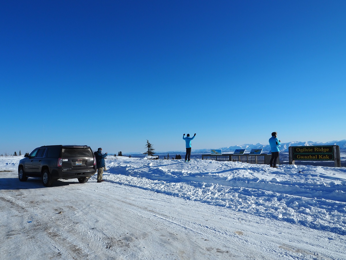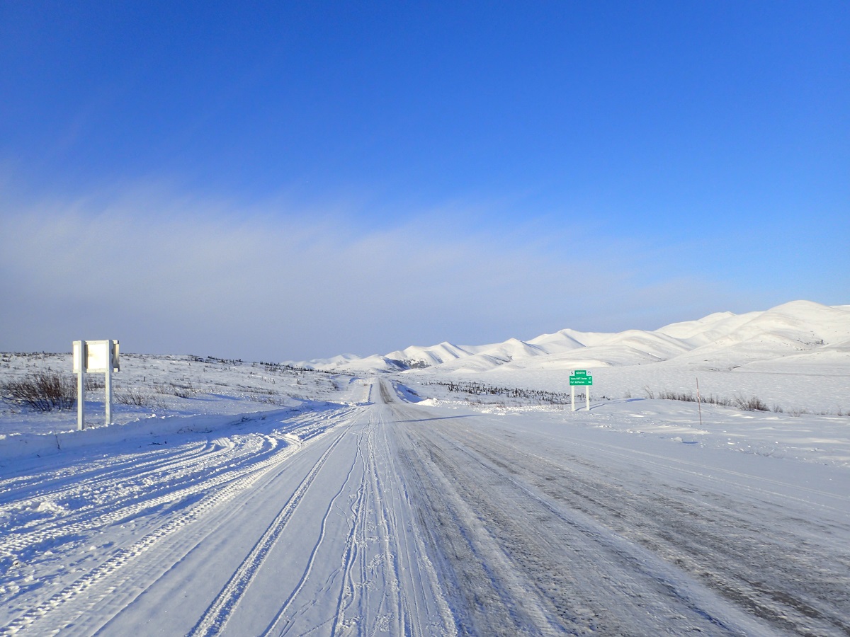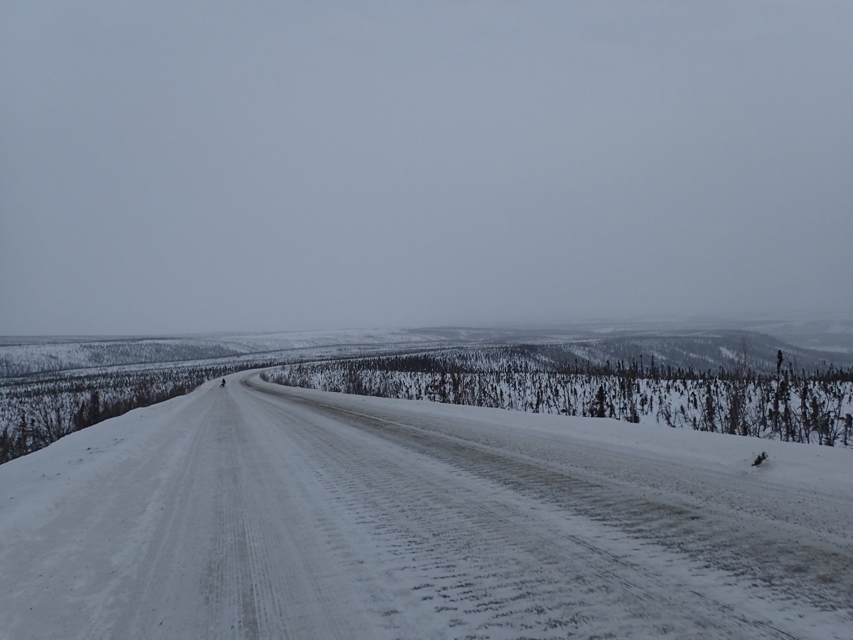 ドーソンシティを出て昨日来た道を少し戻って?デンプスターハイウェイに入る。この先は小さな集落しかなさそうだし道も悪いのかと思ったら、車は昨日と変わらない道を100km/hほどで走っていく。途中2回景色のいいところで車を停めてくれて、外を歩いたり写真を撮ったりできた。今日は暖かく(マイナス15度くらいだが直射日光があるので)風も弱いのでレース中もこんな感じならいいのにと思った。北に行けば行くほど木は生えていないし、あっても背が低くなっていくので風が吹いたら大変なことになるのは想像できる。どのくらい大変なのかはよくわからないが。