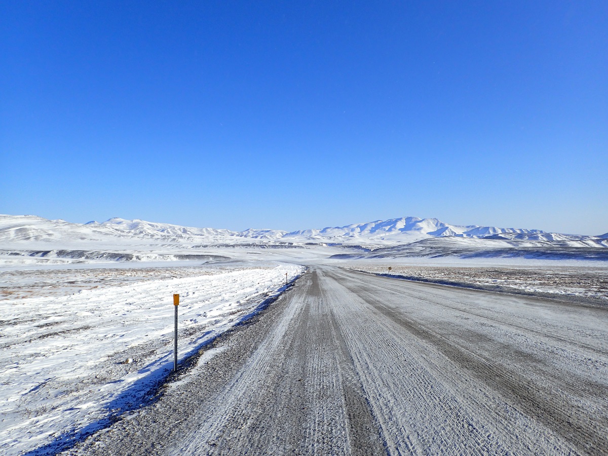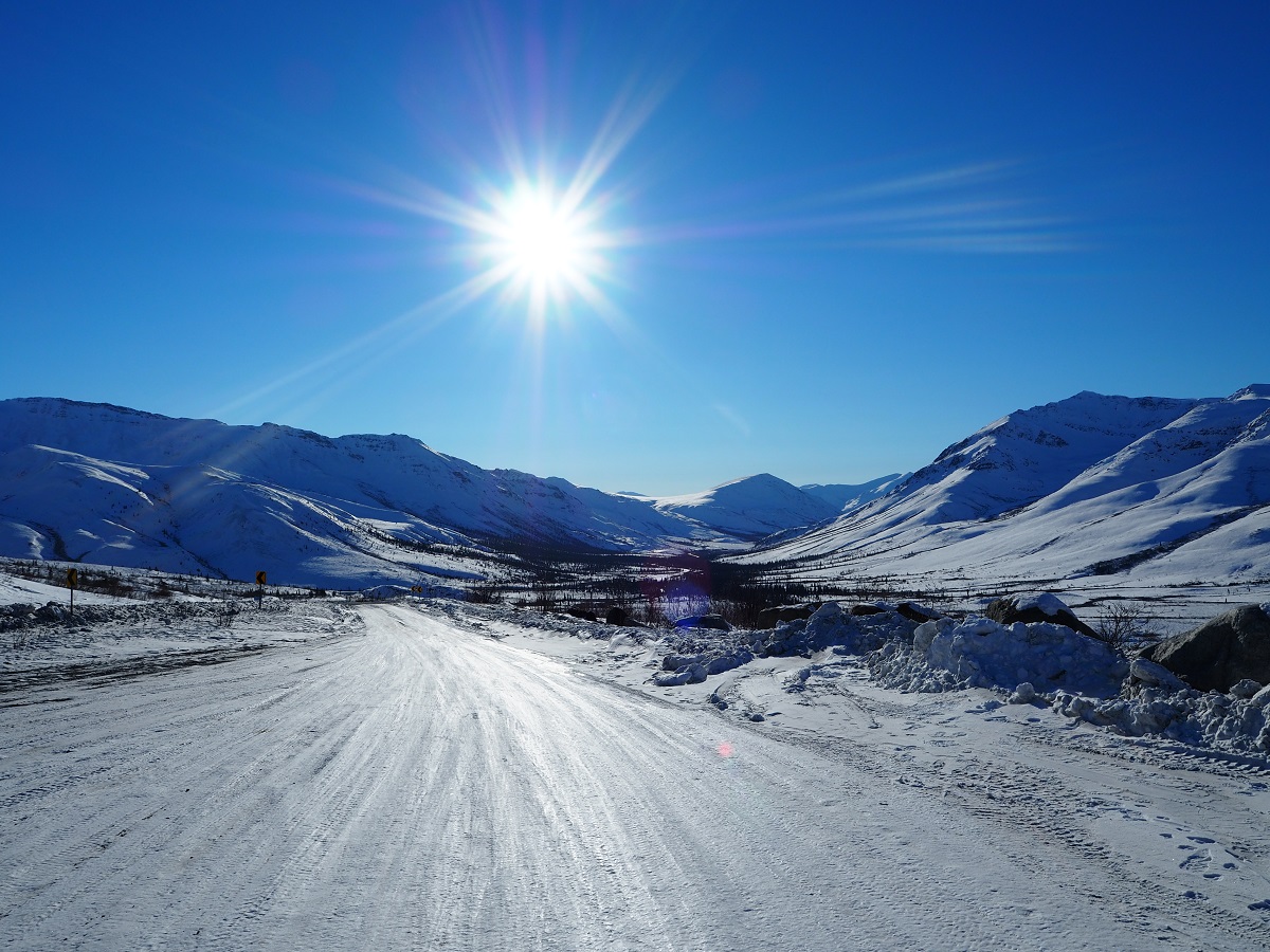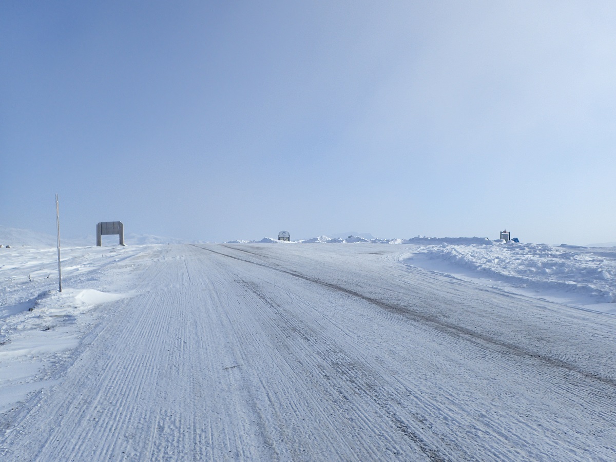 ドーソンシティを出て昨日来た道を少し戻って?デンプスターハイウェイに入る。この先は小さな集落しかなさそうだし道も悪いのかと思ったら、車は昨日と変わらない道を100km/hほどで走っていく。途中2回景色のいいところで車を停めてくれて、外を歩いたり写真を撮ったりできた。今日は暖かく(マイナス15度くらいだが直射日光があるので)風も弱いのでレース中もこんな感じならいいのにと思った。北に行けば行くほど木は生えていないし、あっても背が低くなっていくので風が吹いたら大変なことになるのは想像できる。どのくらい大変なのかはよくわからないが。