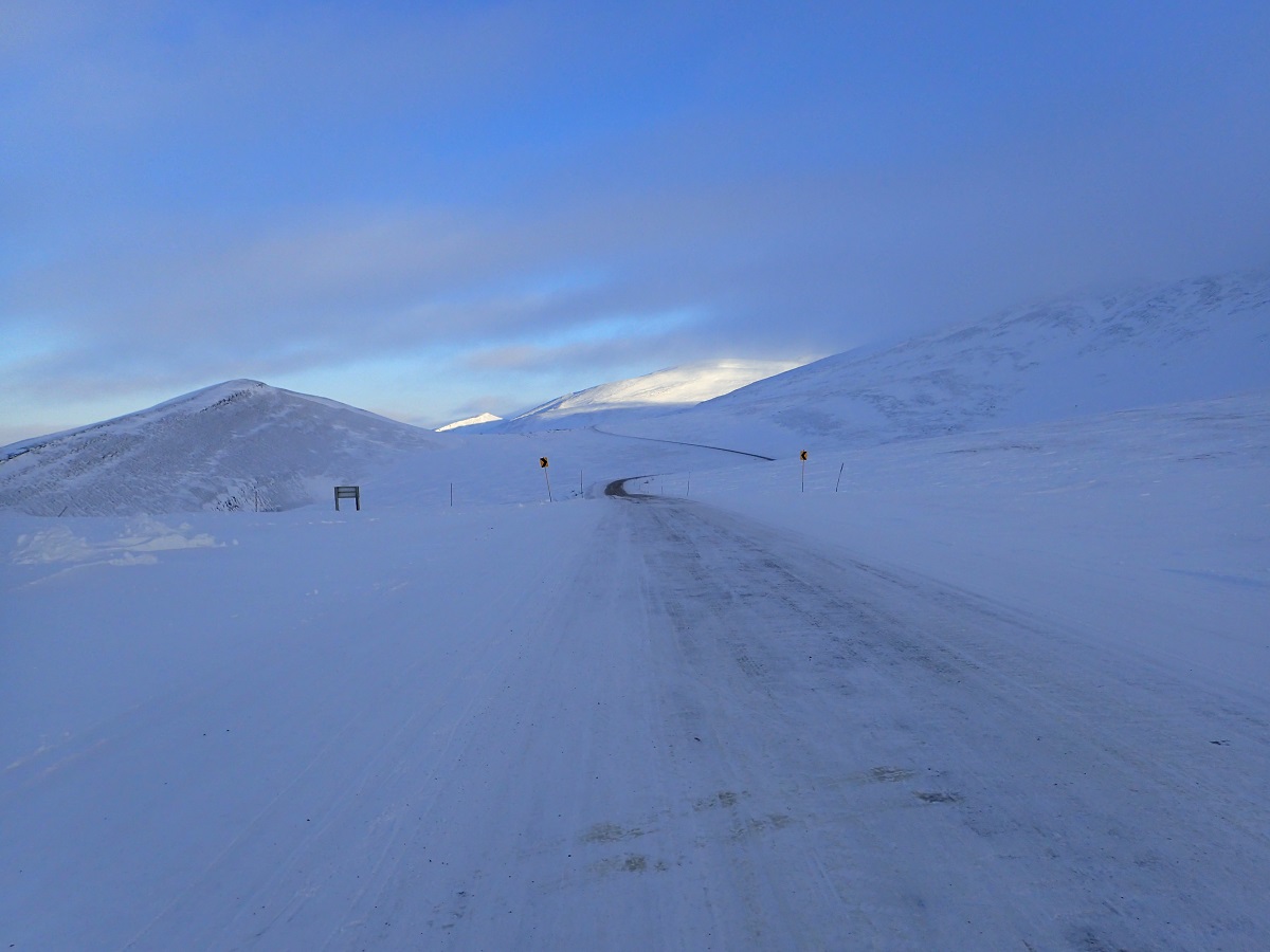 空にはうっすらオーロラが出ているのを見ながら再スタート。急坂を下り、V字に登ってその後はわりと平ら。3時間の停滞で自分の位置はどうなったか心配になる。順位狙いではないのだが最後尾になると主催者のチェックが厳しくなりそうな気がして最後尾だけにはなりたくない。後ろから大会スタッフの車が来て「あなたの友達を後ろに乗せているぞ」と後ろを指すので(英語がいまいちわかっていないこともあり)意味が分からず道路の後方を見る。すると車の後部座席の窓が開いて松村さんが乗っていた。「リタイア?」と聞くと「低体温症で回収されちゃった」とのこと。なんという打ち上げ花火・・・かける言葉が見つからず「がんばってくるわー」と声をかけた気がする。自分のほうはビバーク後のウエアで問題なくこのまま行けそう。