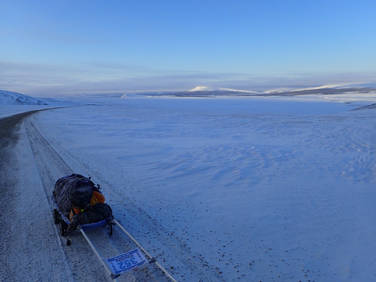 体がきついと思わない程度のペースで歩く。今夜は少し早めスタートから60kmくらい目安でビバークして睡眠を取るつもり。ホワイトホースを出発する前日にリヤカーマンの人と電話をしてコース情報をもらったのだが、ノースウエスト準州との境界(ボーダー)付近は風が強く休むのに適した場所がないため、その手前登り始める前に休んだほうがいいだろうと意見をもらった。そこで1日目を短く刻み元気な状態でボーダー越えをしようと考えていた。日が沈んで気温が下がると手足の冷えが顕著になってくる。少し気合いを入れて歩いても日中にびっしょり汗をかいた影響で体温は上がらない。ベイパーバリアしているのでウェアが濡れてすぐに保温できなくなるようなことはないが、ベイパーバリアのない手首あたりに回り込んだ湿気(汗)がウェアの袖を凍らせている。