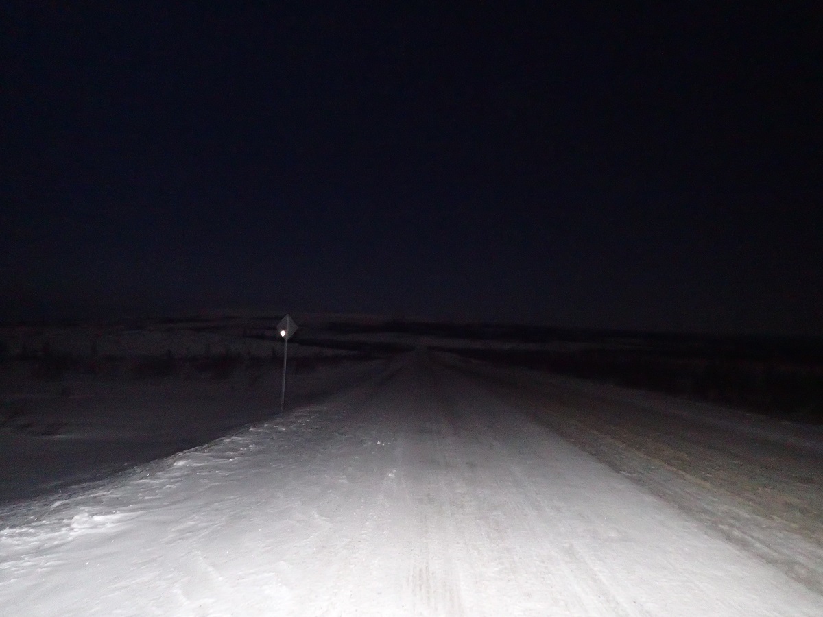 2時間半で目が覚めたので出発の準備。滞在5時間。23時4分に出発。ソリを引いて町の入口に向かって歩いていると近くの家の人が声援を送ってくれたりする。再びデンプスターハイウェイへ。フォートマクファーソンの町明かりを後にまっくらな道を突き進む。やっぱり人工の光から離れていくのはちょっと寂しい。いいペースで進んでいると前の選手に追いついた。停止してコーヒーを飲んでいる。「コーヒーいるか?」と勧められたが、がしがし進んでいたので「No, thank you」。後からちょっとくらい足を止めてもよかったかなと思った。