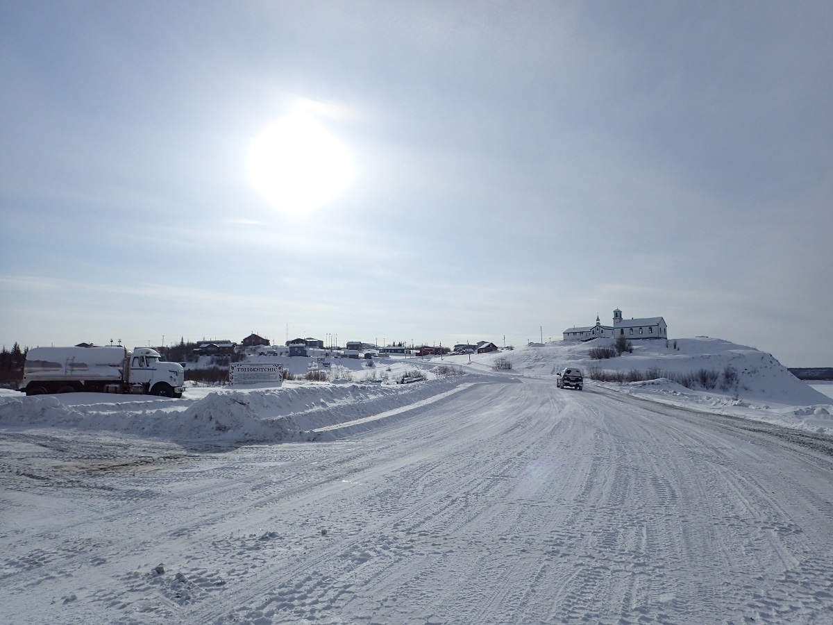 終盤はやっぱり足のむくみで痛い。やっとツィーゲーチックが見えてそこまでは下りなのに小走りすらできない。この先のことを考えると少し気が重くなってしまう。レース後半のアイスロードはある程度走れればという希望も持っているがこの痛み、この足の重さでは厳しい。マッケンジーリバーを渡るところで前の選手が迷っている。川の上をよくよく見ればツィーゲーチックを一度後ろに見るような方向に凍った川の上を進んでから右に曲がる道があるのに、そっちに行くとツィーゲーチックを通り過ぎてしまうと思っているらしい。思い切ってあと少し進めば看板も見えているのに。うまく説明できないので行動で示そうと選手を無視して進む。前にいた選手は通りすがりの車を捕まえてツィーゲーチックへの行き方を聞いている。そしてやっぱりこのまま川に進めばよいとのことだった。少し進んで分岐に来るとそこに大会スタッフの車がいてフォートマクファーソンのときと同様に後ろについてくるようにとのこと。ツィーゲーチックは小さな集落という感じ。こんな場所に人が住んでいるのが驚きで何を生活の糧にしているんだろう。家とかの見た目は普通だし教会があったり公園?(遊具のようなものが見えたが気のせいか?)があったりする。ツィーゲーチック到着14:35、予定より40分遅れ。
