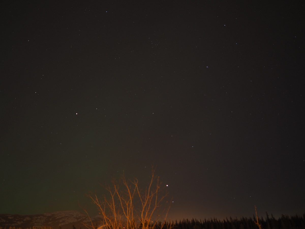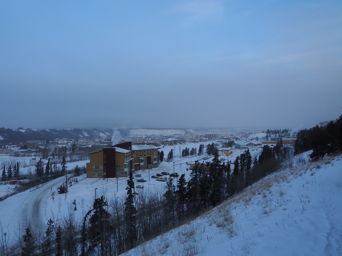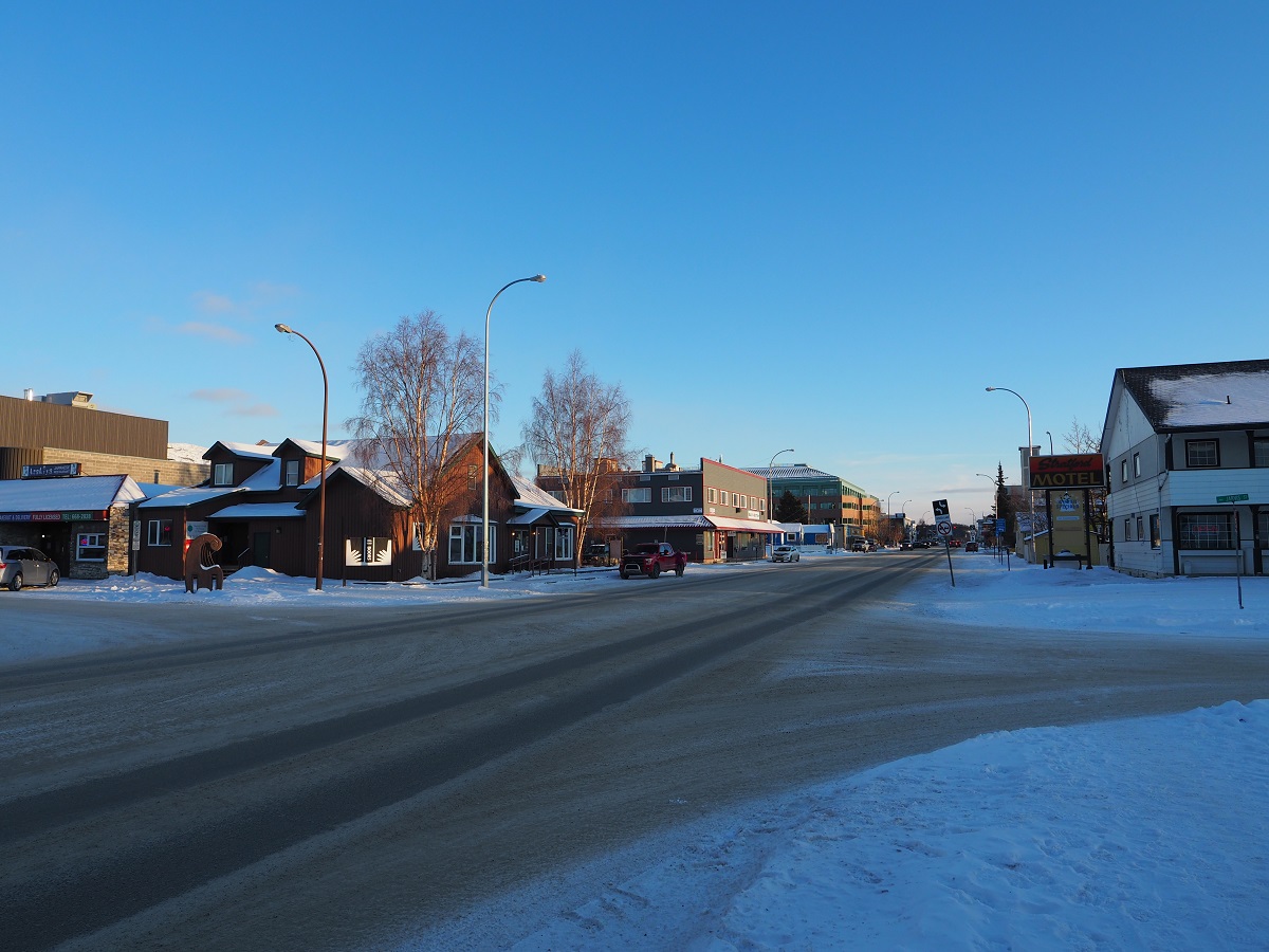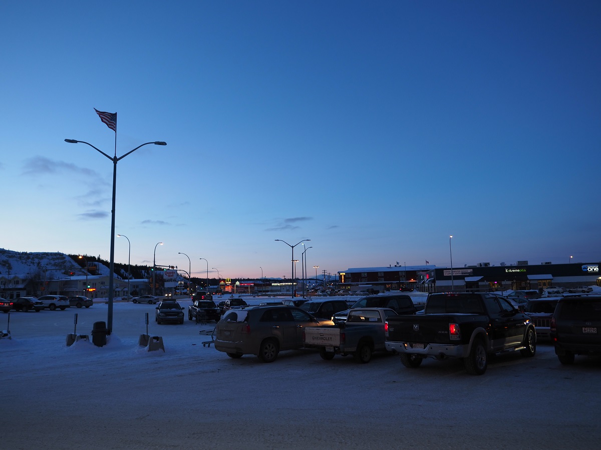 深夜オーロラが出ていないか様子を見にユーコン川沿いへ散歩。しかし思った以上に明るくライトアップされていて、街の明かりが目に入らない場所が見つからずオーロラも見れずモーテルに戻る。すると櫛田さんから「オーロラ見えているがダウンタウンから見えるか?」とメッセージが入っていたので、もう一度出かけて今度は確実に明かりが入らない場所を目指し街はずれへ。クロンダイク号のそばからユーコン川・リバーデール方向を見ると明かりが少ない。しかし写真も撮ってみたがオーロラは見れなかった。しかしオーロラが出たときの撮影手順・設定を予行練習できたのでよしとする。帰り道顔が冷えて痛くなってきたのでバラクラバを着けようと思ったらザックに入れたつもりだったのにない。口と鼻が痛いので手袋で顔を押さえて走って帰った。バラクラバは床に落ちていた。危うく街で凍傷になるところだった。気温はマイナス22度。過去2年は自分が帰る2月下旬で0度くらいまで気温が上がって雪が解けていたのに今年はキンキンに冷えています。