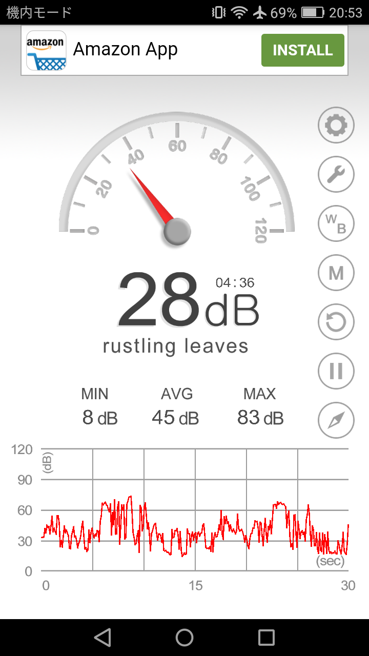 戻って眠くなったので昼寝(?)。起きると空っちが泣いていたのでデシベルメーターのアプリをインストールして空っちの前に置いてみる。