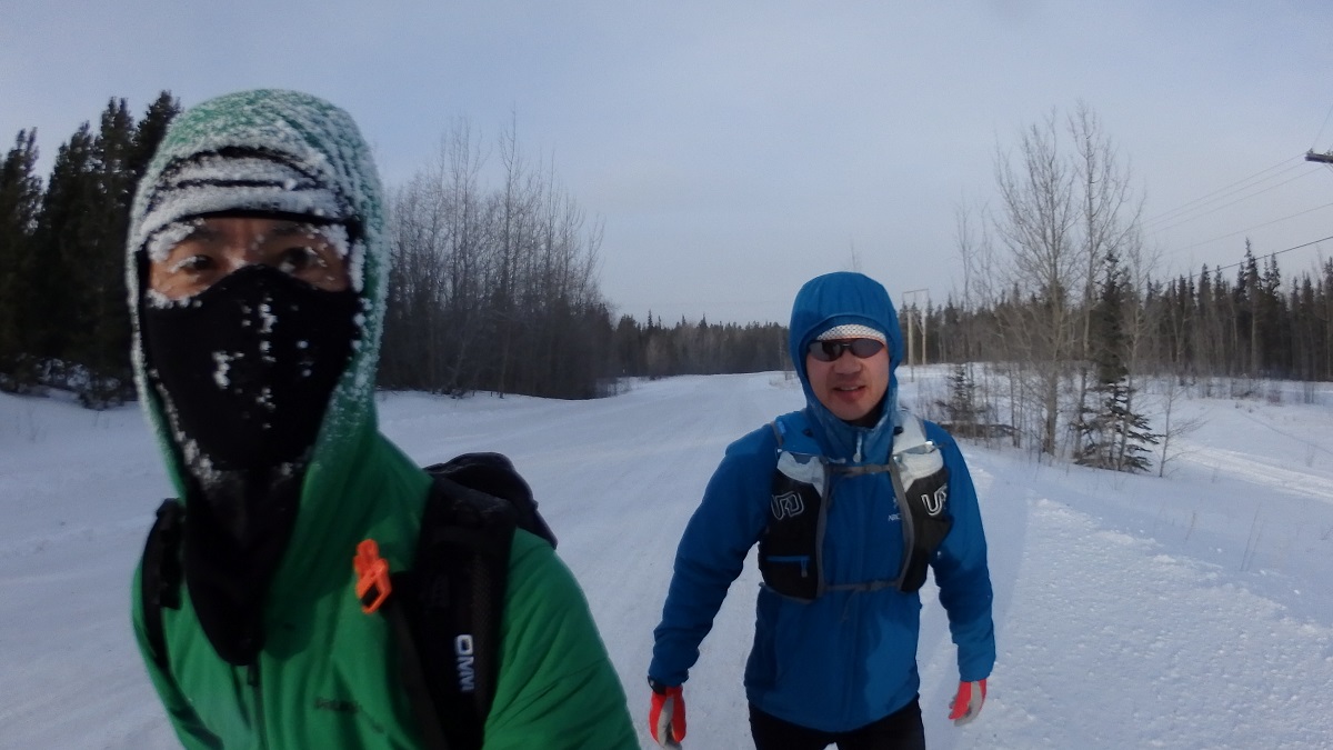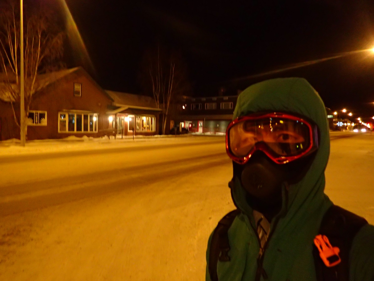 朝8時にハイカントリーインに行き松村さんと合流。今日はフィッシュレイクにトレッキングに行く予定だったが、松村さんのソリがバンクーバーでロストして届いていないので、その状況で丸1日町から離れるのは不安だろうということで近所に走り(歩き)に行くことにした。ウエアは本番と同様にして装備の確認をおこなうことにする。ただゴーグルではなくメガネにしてきてしまった。気温はマイナス25度でテスト環境としてはよい条件。