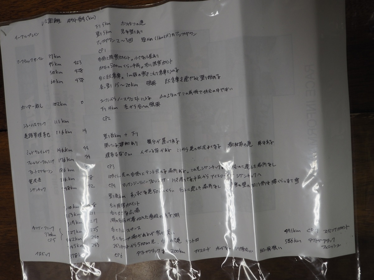 佐々木さんは予定通りにいけば3/17にタクトヤクタック着だそうで、私のレースは3/18フィニッシュ関門なのでタクトヤクタックで佐々木さんに出会うことになる。きちんとフィニッシュできればいいが、話を聞くとあまりの厳しい環境に自分にできるという確信はまったく持てませんでした。人をなぎ倒す体感気温マイナス50度の風とかやばすぎます。RPGで氷系の攻撃を受け続けている感じです。さっそく携帯するレース計画の裏面に教えていただいた情報をまとめました。