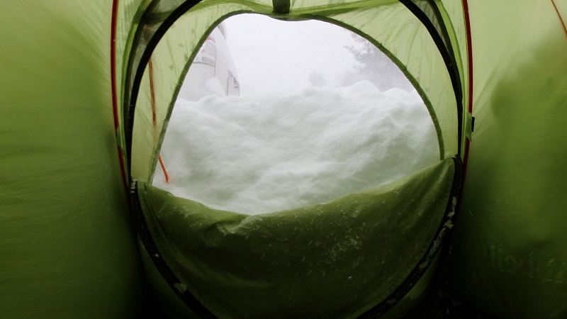3時間ちょっと眠って目を覚ますとシェルターが雪で外から押されて狭くなってきている。片付けをして入り口を開けると雪の壁になっていた。オーバーグローブをしたまま片付け完了。
