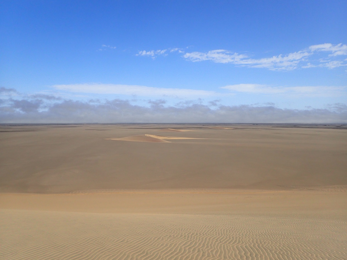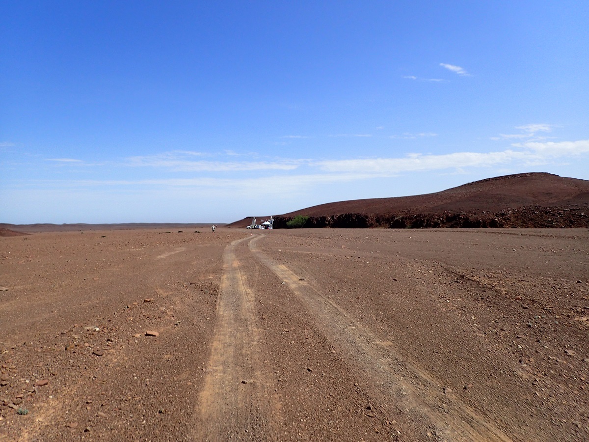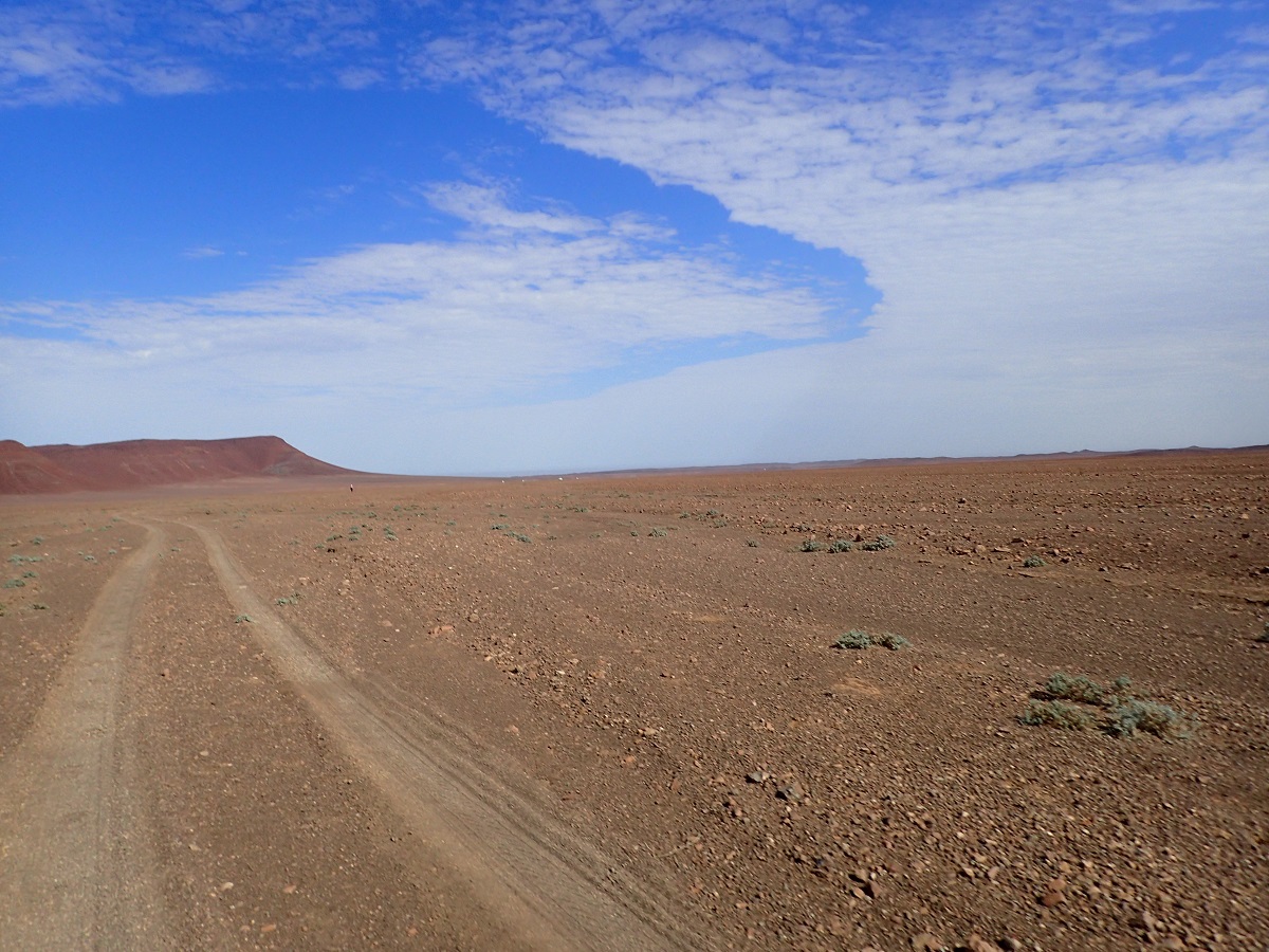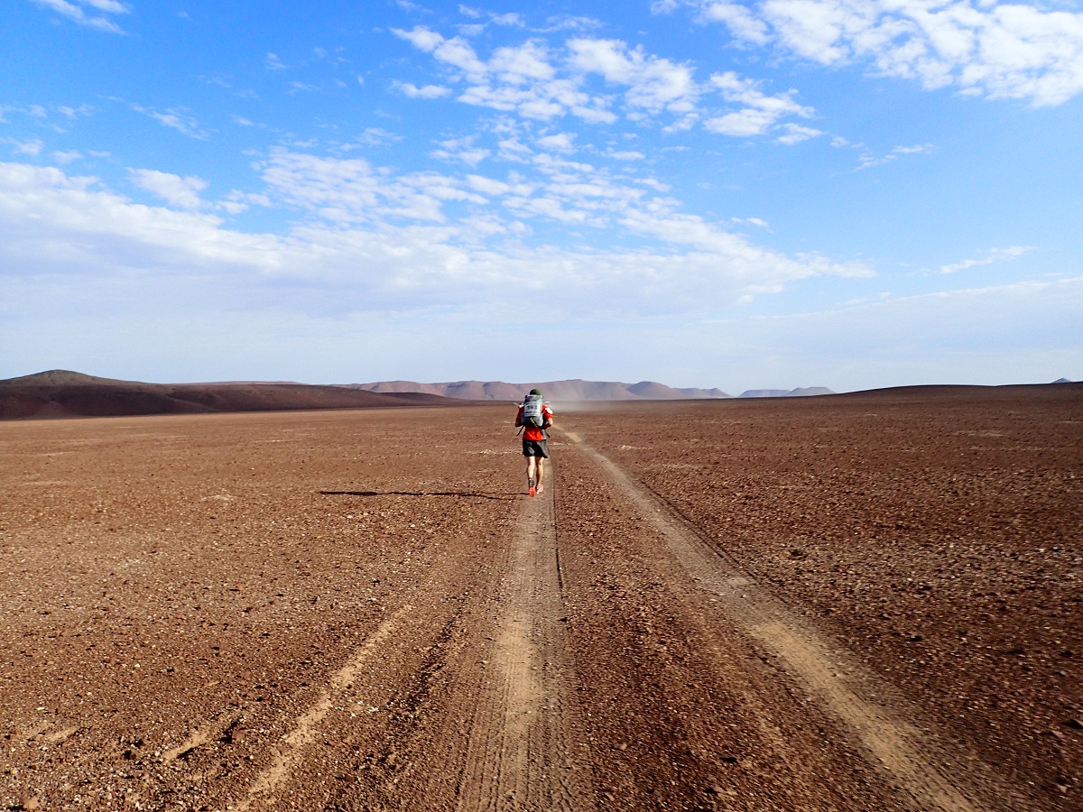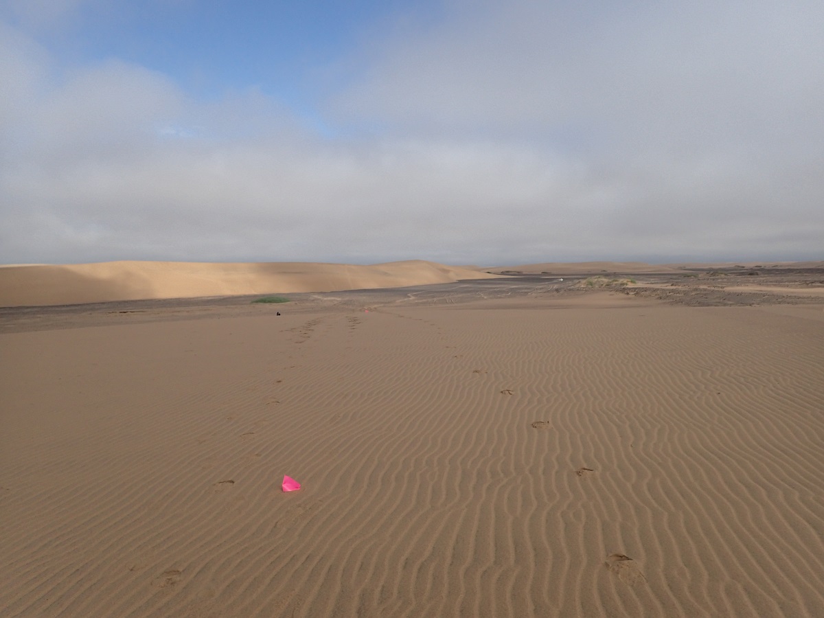 昨日、今日のキャンプ地はいかにも砂漠という感じで湿度も少なく、風も海風がなく過ごしやすいので外でゆっくり食事をしたり話をしたりすることができた。1日目にできた水膨れは水を抜いて薄いソックスを使うようにしてから問題なくなった。夜寝るときはシュラフがオーバースペックで暑くかといってシュラフなしだと寒いので温度調節に苦労する。ウエアを着たままシュラフに入ると汗でウェアを濡らしてしまうためシュラフの中でウェアを脱いでパンツ(ランニングパンツのインナーだけ)1枚で寝た。