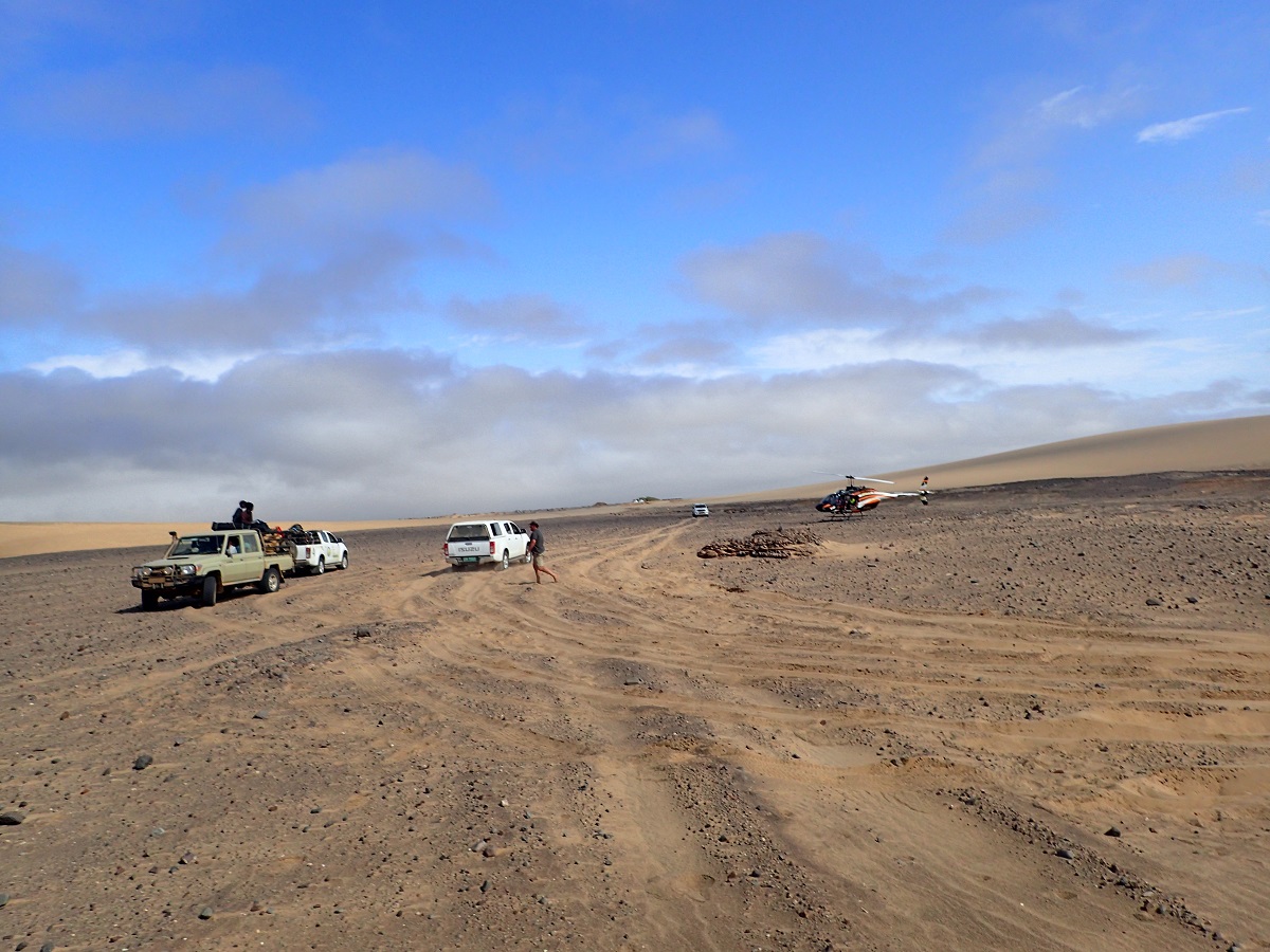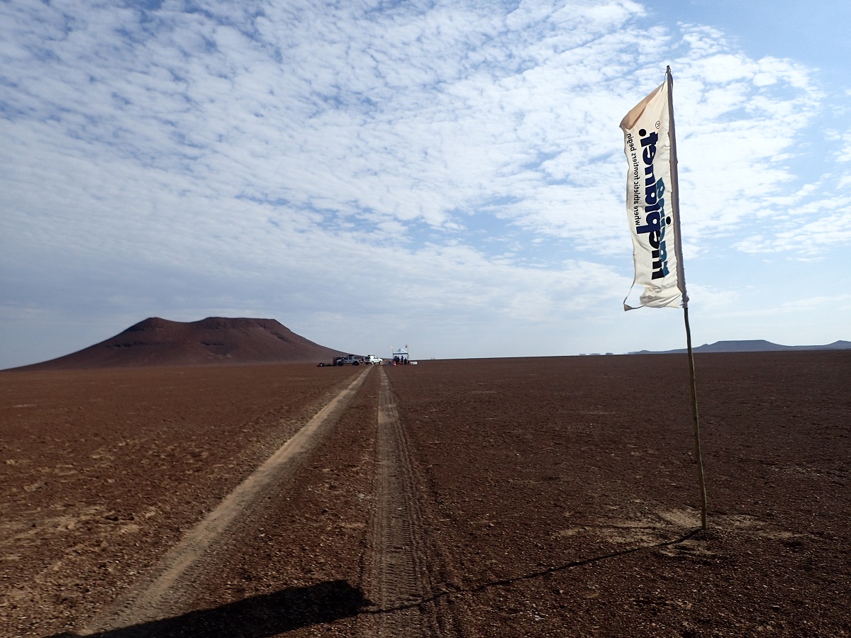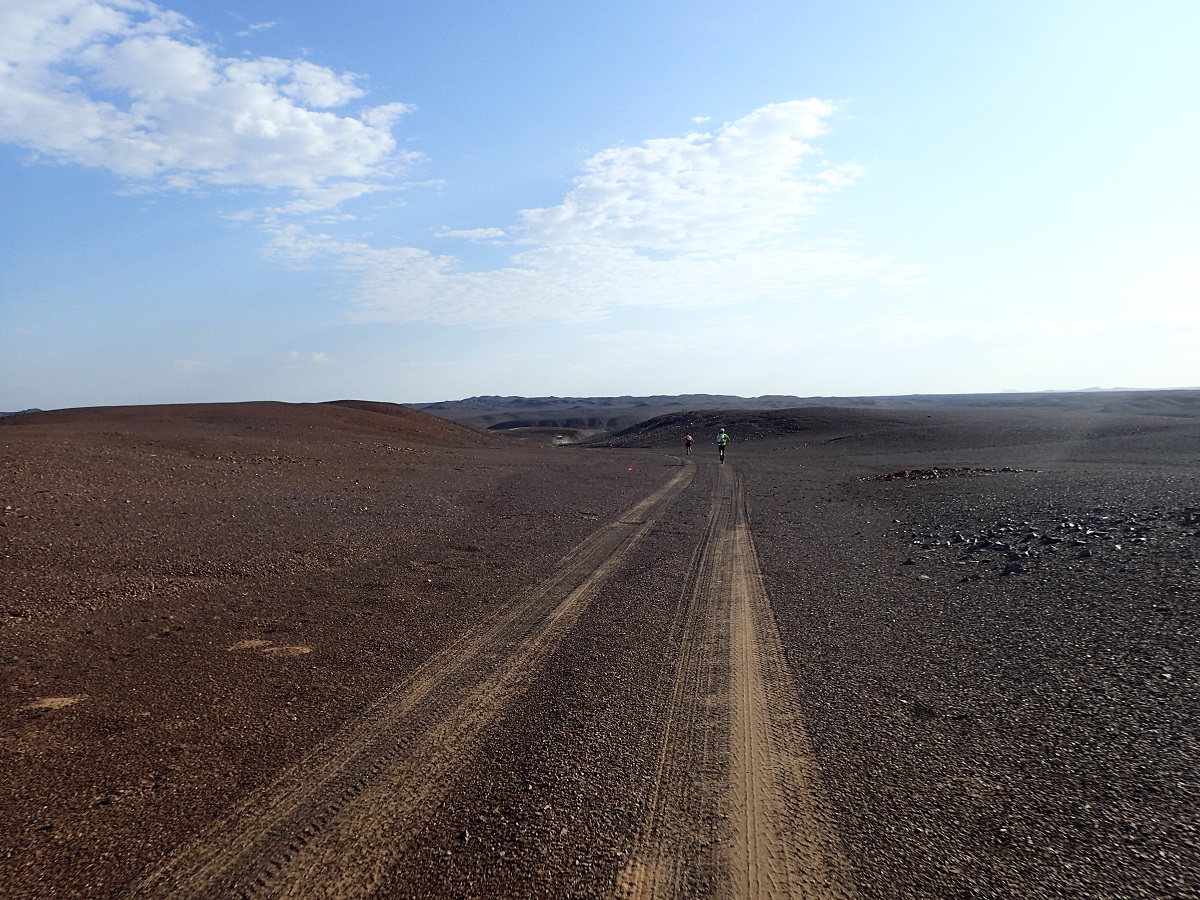 今日のコースはコース説明で終盤の一部以外全て「easy」と書かれているので、ずっと固い地面かなと思っていたらだんだん砂が多くなってきた。左右に小さな砂丘が見えるようになり見たかった砂漠の景色になってくる。小さな砂丘を越えるときに砂丘の上で後ろを振り返ると若岡さんっぽい人影しか見えなかった。後ろのみなさんも入賞するためには今日が勝負のはずなのにどうしたんだろう?CP2の手前で撮影班の乗ったヘリが地上にいた。砂丘地帯は空撮は楽しみだな。