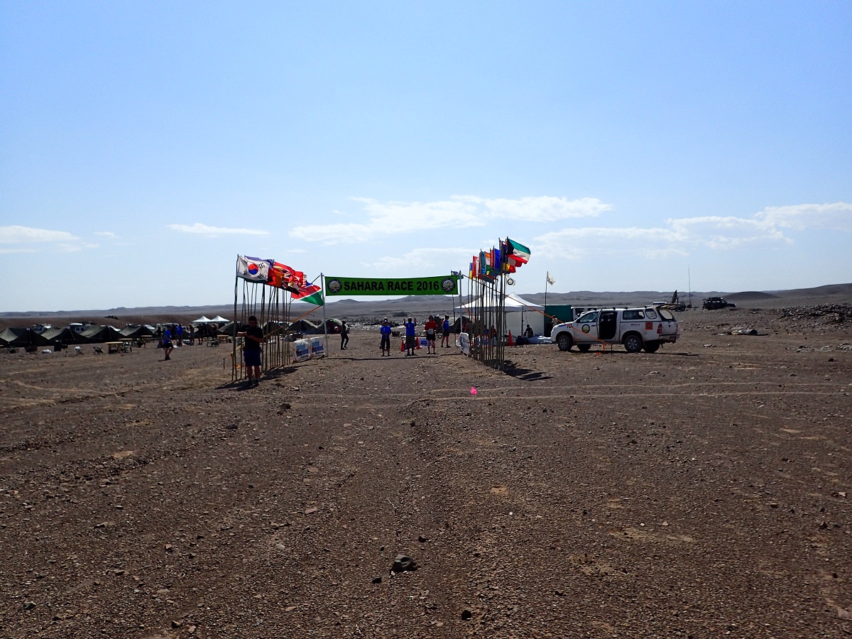CP3を出て最後の区間。体調もよく疲れもなく明日のロングに向けて無難な走りができていることを確信。かなり暑いので油断禁物ではあるが。それまでと同様にたんたんと走り「そろそろゴールが見えるかな?」と思ったところで「HALFWAY」の目印が設置されていてガクッと来たが目印が間違いで間もなくキャンプ地が見えてきた。あまりにもあっさりとキャンプ地が見えてきたので、キャンプ地の手前に(見えないけど)谷があったり、直前で回り道させられてキャンプ地の周りをぐるっと回ったりするのかなと思ったが、コースはまっすぐフィニッシュに続いていた。(4desertsにしては珍しい。だいたいフィニッシュ前は意地悪コースが多い)
