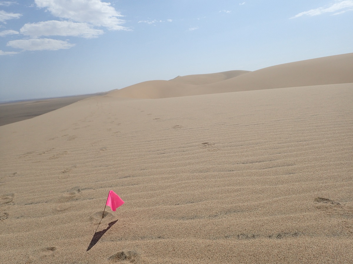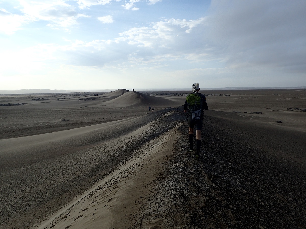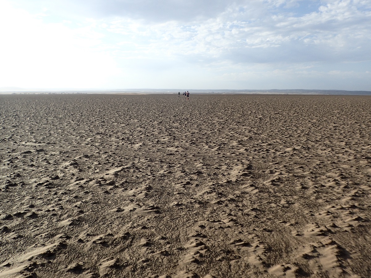 CP3を過ぎると固くて平らな地面。足場が柔らかいと時間がかかるので時にはこういう固い地面があると助かる。途中に1つだけ孤立した砂山がありピンクフラッグは壁のような斜面を登るように続いている。すぐ脇を迂回すれば平らなところだけ走っていけるのに。その後はまた走りやすい平地。30kmを超えたので後半に備えて走りながらお昼ご飯。少しペースを落としてドライフルーツをもりもり食べながら進む。CP4の手前で固い地面から塩が固まったような地面になり1歩1歩ぼこぼこと沈み込む感じ。アタカマのソルトフラットをうんとソフトにした感じ。CP4に到着して久しぶりに後ろを見るとソルトフラットの真ん中あたりを1人選手が進んでいる。たぶん若岡さんだろう。その後ろはまったく見えない。