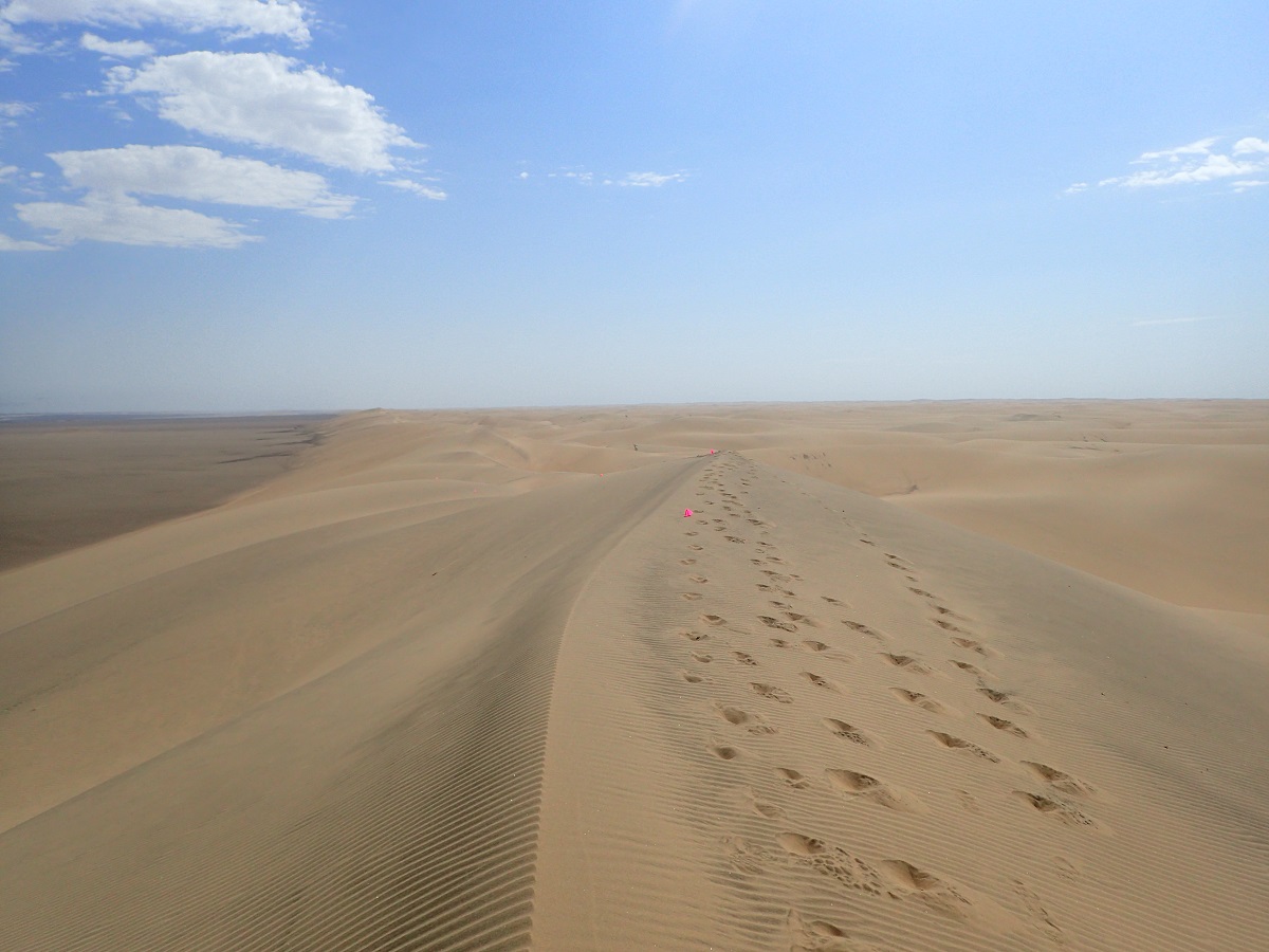 CP2を過ぎると大きな砂丘が見えてきた。コースは砂丘の尾根の脇(片斜面)についている。砂はさらさらでやっぱり進まない。どう考えても「easy」じゃないだろうと思う。砂の上にきれいなトカゲがいるのを見つけた。テレビで見たことがあるやつだ。写真を撮ろうとして追いかけたがすごい速さで走って逃げられてしまった。接近せずに写真を撮ってしまえばよかった。コースは巨大な砂丘を登っていく。絶対easyじゃないって!こういうコース好きだけど。せっかくの巨大砂丘なので動画を撮りながら登っていく。一番高い山頂に撮影班の田中さんがいて「(動画撮影しているので)上位を走っている選手に見えませんね」と言われる。「これも含めて自分のレースなんでー」と返し山頂で周囲の景色をぐるりと撮影。山頂の砂の上にゴキブリのような昆虫がいたので激写。でもやっぱりトカゲを逃してしまったのが悔やまれる。山頂からの砂丘の尾根は固い砂地でわりと走りやすかった。しばらく景色のいい砂丘の上を走る。コースが方向を変えて砂丘から降りはじめるところにサマンサ(主催者)がいたので写真を撮ってもらった(後から考えたら一緒に写ってもらえばよかった)。サマンサに「カメラがヘビーだ」と言われるが「趣味なんでー」と(当然英語で)返事。コンパクトカメラではあるが高機能で重いのは承知の上で使っている。砂丘を駆け下りてCP3に到着。