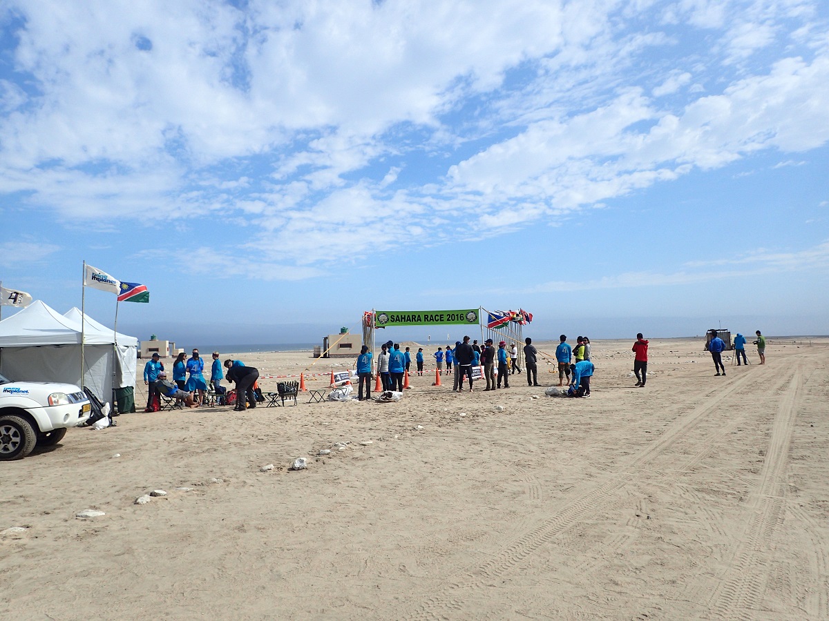 距離が短いだけにけっこう苦しんでフィニッシュへ。やっと終わったー!とフィニッシュ!2007年のモロッコから始まった砂漠レースチャレンジは全て終了。2009年サハラレース(エジプト)のリタイアのリベンジも完了。これまでの砂漠レース中でも最も気分的にすがすがしい感じ。全てが終わったってすごく気持ちがいい!思わず涙を流して喜んでしまった!若岡さんとコースを少し戻ってフィニッシュに向かう選手を応援する。海沿いはいつも霧で曇っていたけれど今日は青空で気持ちよくフィニッシュ日和。