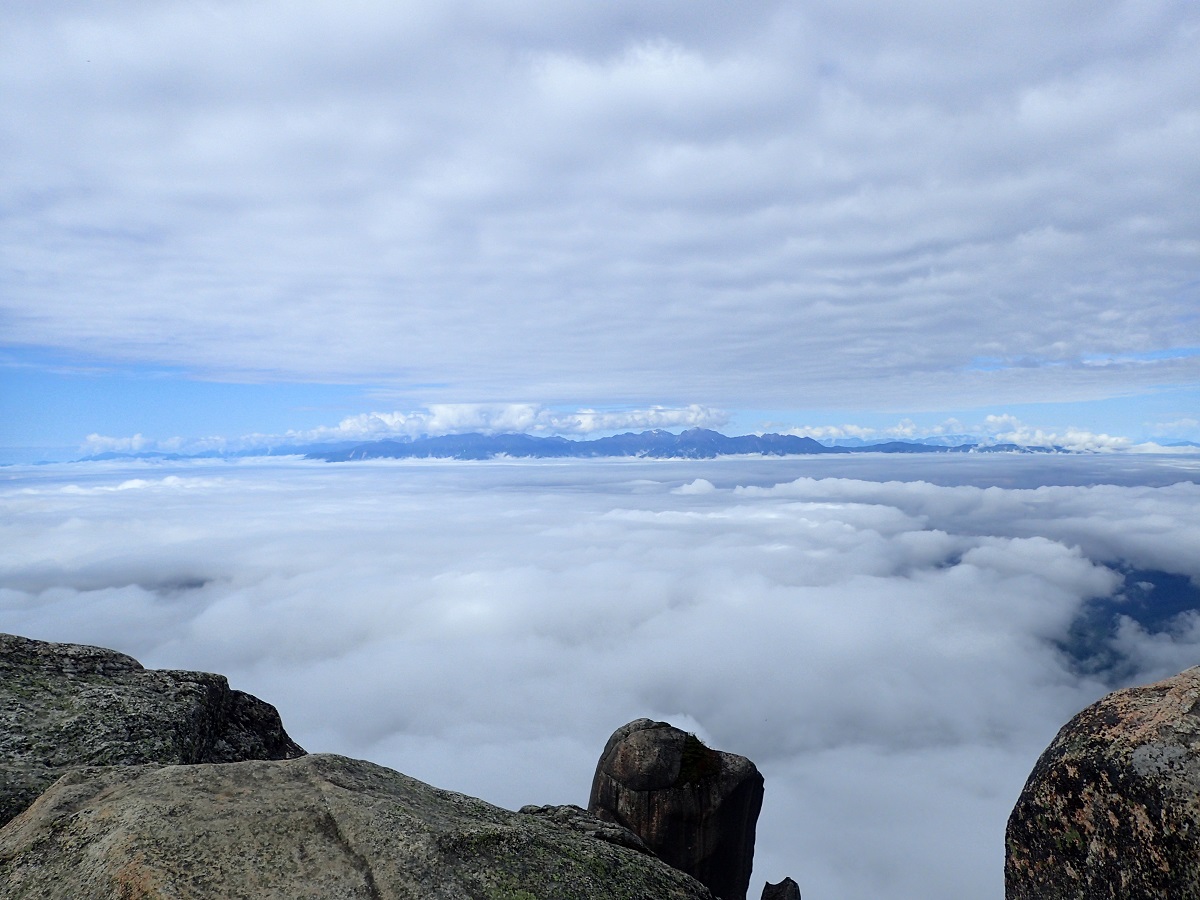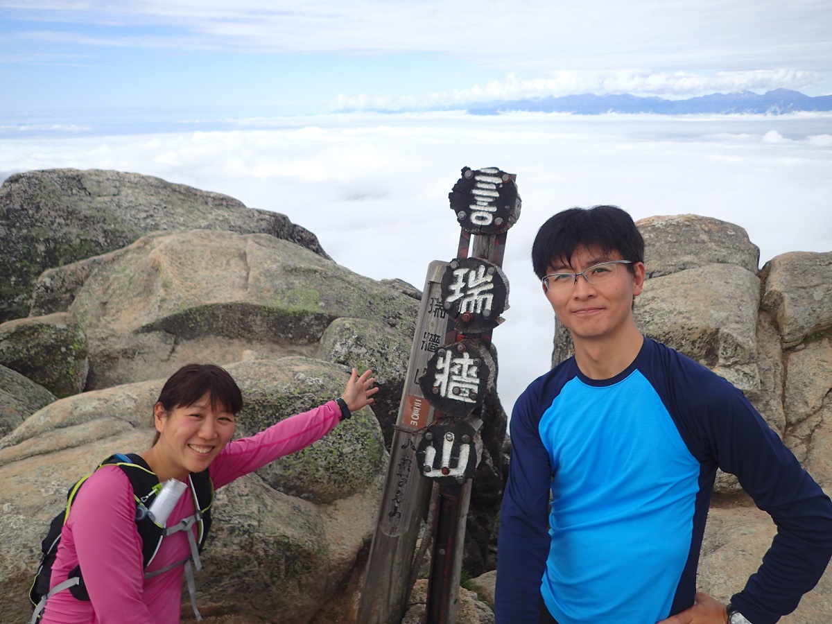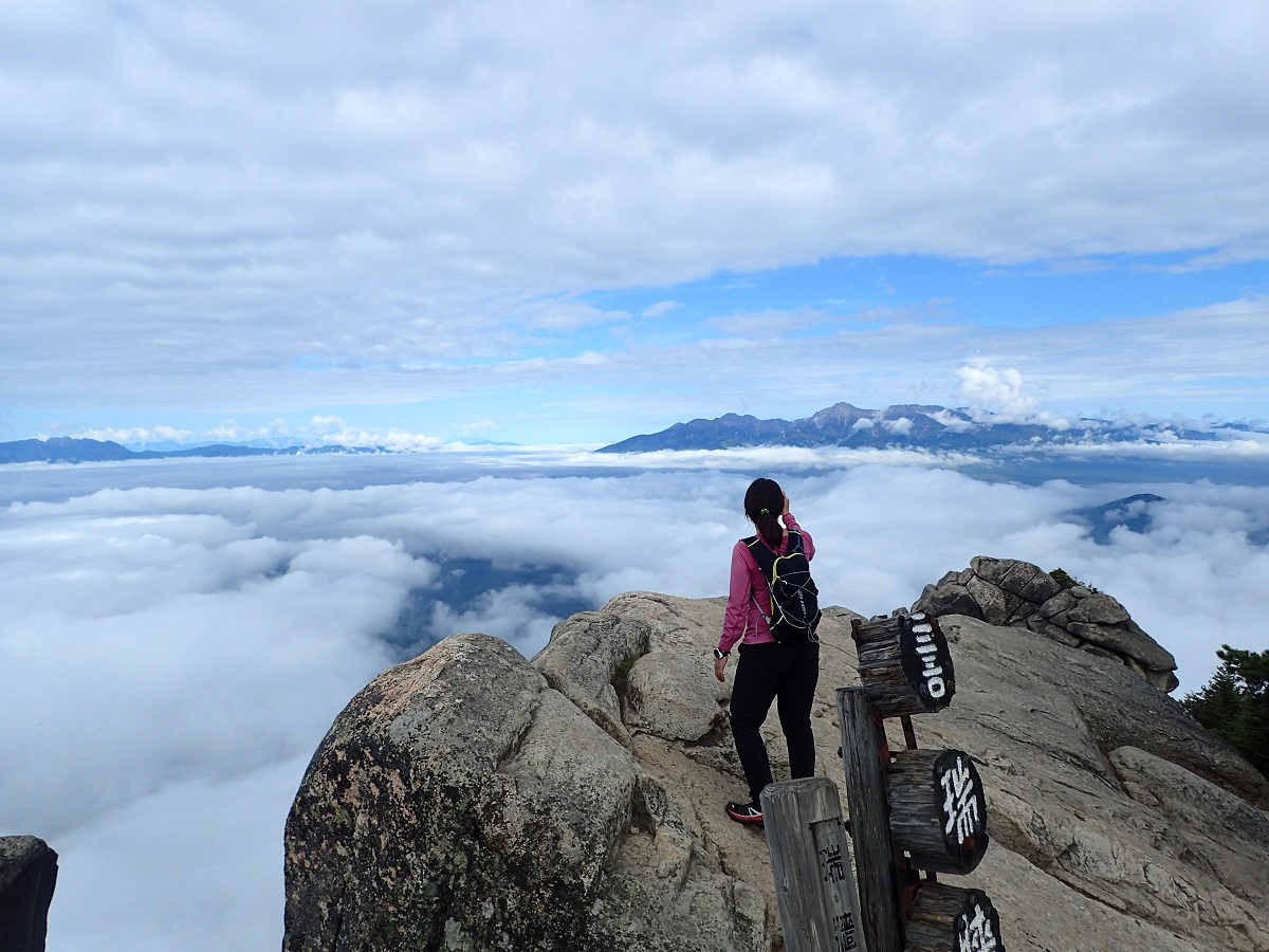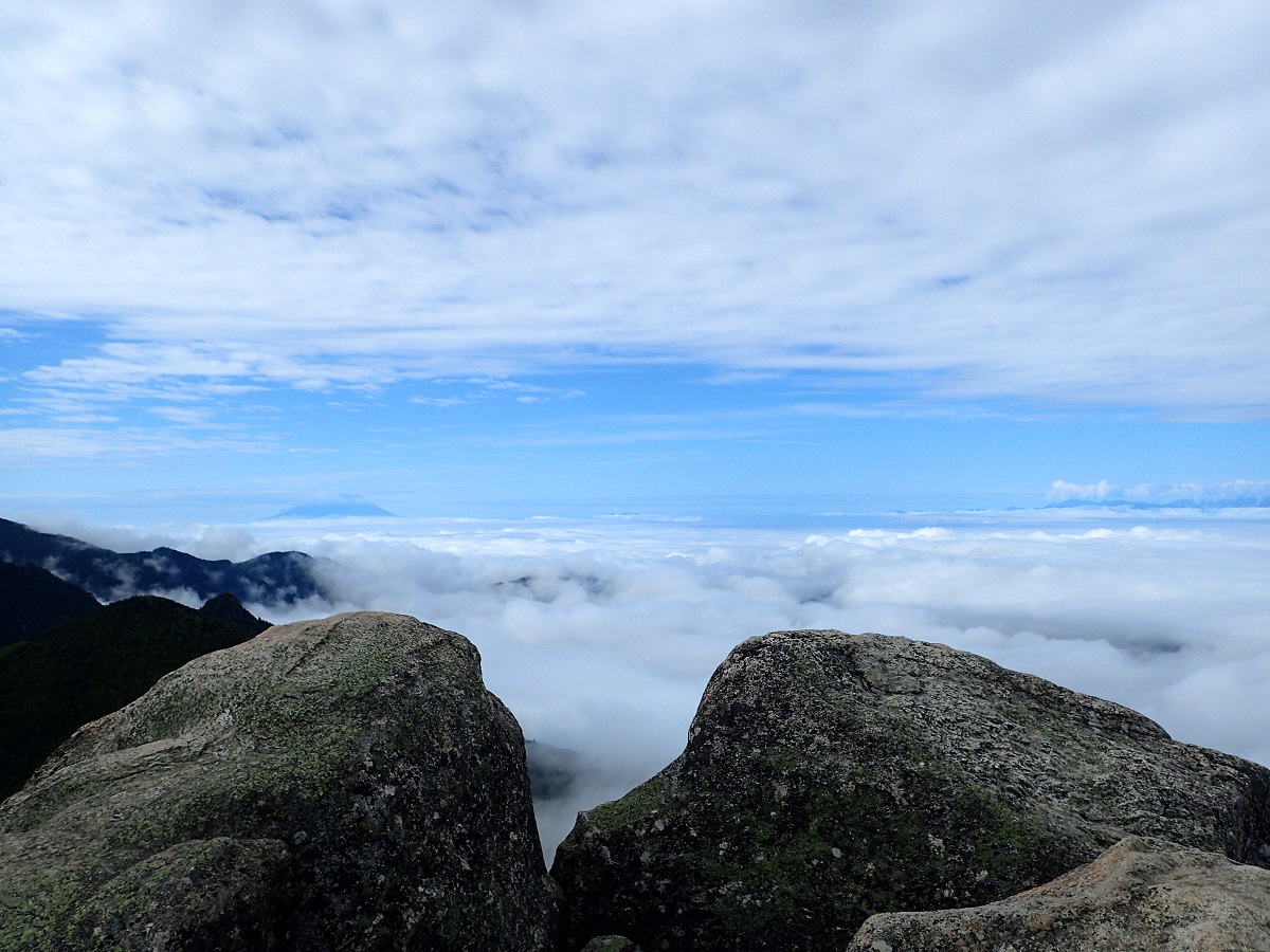 瑞牆山山頂に8時に到着。下のほうでは今にも雨が降り出しそうだったが途中から雲の上に出て山頂は快晴だった。八ヶ岳、南アルプス、富士山が雲海の上に浮かび上がっていて素晴らしい。高度感がすごい。瑞牆山の山頂は初めてで今回の山のハイライト。山頂のすぐそばは過去の分水嶺トレイルの出場で2回通過しているが、2回とも日没直前だったので山頂を踏まずに先を急いでいた。ようやく山頂の景色を見たいという希望がかなった。ここから野辺山までは地図読みが必要な区間で過去2回の経験では夜だったりしてかなり長いと感じていたが、今回は昼間なので現在地も簡単に把握できるし距離も短く感じた。