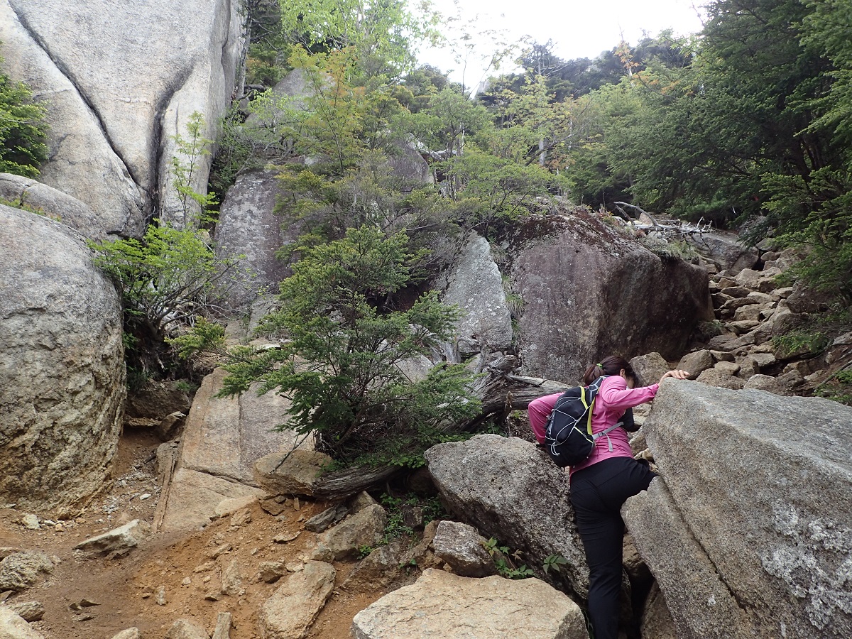4時すぎに韮崎インターを出たところのローソンでポーリンと待ち合わせ。韮崎駅にポーリンの車を置いて私の車でみずがき山荘に行く。6時に登山開始。瑞牆山への登り始めになる富士見平小屋には金峰山のほうからしか行ったことがなかったため近くまで車で行けるところなのかと思っていたが、みずがき山荘からそこそこしっかり登った。天気はどんよりと曇っていて景色は期待できない。登っていると蒸し暑くびっしょりと汗をかく。今日は10時間は動くことになるためあまり汗をかくと水切れにならないか心配。がっつり登る登山はすっかりご無沙汰なので、ポーリンのペースだが呼吸は苦しく、筋力的にもゆとりがあるとは言いがたい。