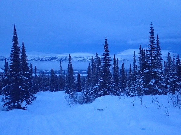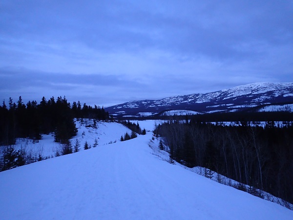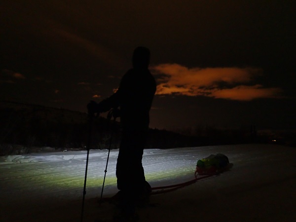 ポンプは部屋に置いてありそれを持って再スタート。17時20分、もうすぐ日が暮れる。。。フィッシュレイクのがっつり登りに入るときにはすっかり夜に。薄っすらとオーロラも出ていたが今日は薄曇りなので写真を撮りたいほどのオーロラにはならず。暗い山を歩いていると「もし自分と同じことをしている人に出会ったら怖いだろうな」と思う。夜23時過ぎに下のほうから猛スピードで上がってくるスノーモービルがあった。男女2人乗りで「Helloー!」と声をあげて走り去って行った。東京で言うと夜の首都高ドライブというところだろうか。