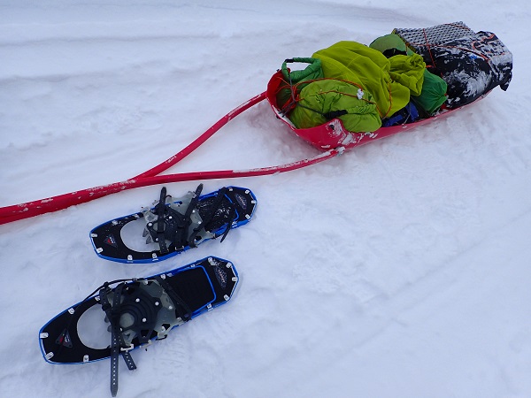 トレイルの入口でスノーシューを履いて歩き始めると前回よりも格段に歩きやすい。重量が増えているのに重さは感じない。さくさく歩いているときふと「ガソリンストーブのポンプはどこに入れたっけ?」と思う。重要装備が荷物のどこにあるのか思い出せないのは気持ち悪いので荷物やポケットを漁ってポンプを探すが見当たらない。基本的に前回の荷物をソリに乗せっぱなしでいて、それを持ってきているのになぜポンプだけないのか。なくても焚き火でお湯わかせると思ったが、たかが練習でストーブを使えないリスクを取りたくないので戻ることにする。もう10kmくらい進んでいるので往復で20kmのロス。20kmという距離は時間にするとちょっとした補給の時間を考慮すると約5時間にもなる。朝出発するつもりだったのが実質夕方出発というまったく違う行程になってしまう。