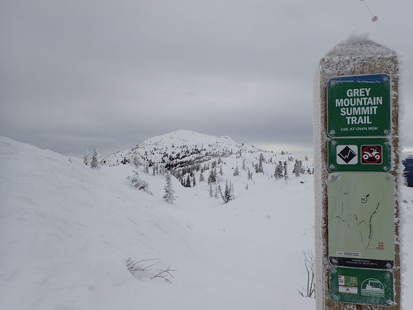 電波塔からグレイマウンテンまでの稜線はすべて見通すことができ、GREY MOUNTAIN SUMMIT TRAILと書かれた案内が立っている。トレイルと思われる方向には人の入った形跡はまったくない。そちらに足を踏み入れると脚の付け根近くまでずぼっと落ちた。スノーシューを持って来ていたので電波塔のそばの吹き溜まりの影で装着。柔らかいモカシンに付けれないかもと思ったがなんとか大丈夫そう(適しているとは言えない)。コーンスープを2杯飲んで給水兼エネルギー補充完了。距離も標高差も大したことないのでなんとか行けるかも。