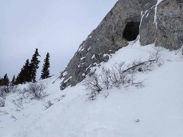 いよいよ山頂か?というところで踏み跡に点々と赤いものが混ざっているのに気がつく。これは血かな。気持ち悪いなと思いながら赤い点々と足跡を追っていくと岩の崖がある。そこに大きな穴が空いていて赤い点々と足跡はその穴の中に消えていた。そこ以外に踏み跡はない。GPSを見ると岩崖の上あと少しくらいのところが稜線で、上がったら稜線の移動距離はわずかで山頂。しかし残念だけどそっと立ち去ることにした。血?の跡が続いている穴に近づきたくない(笑)崖の上に上がるルートもぱっと見わからないし。