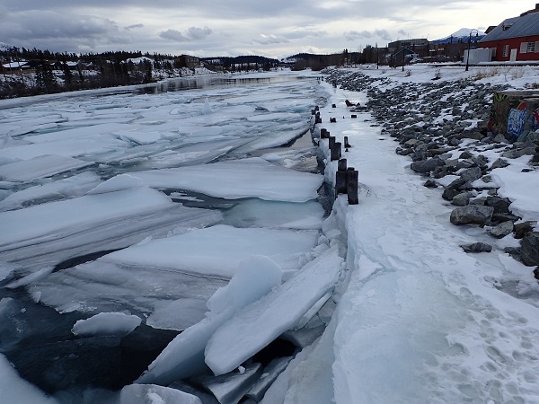 街じゅう雪が解けて大きな水溜りだらけ。すっかり春が来たような様子だが、この状態になるのは本来4月らしいので、もう一度寒くなるだろうとのこと。明日からはまた最高気温がマイナスになり寒くなっていくようだ。この暖かさは1940年以来だとか?1月の下見のときには寒さが続いて電力の消費が過去最高とニュースになったりしたというのに。ユーコン川の氷も解けてきてあちこちで割れた氷が積み重なっている。2週間前に川の上をソリを引いて歩いていたなんて想像できない。街をぐるっと一周しメインストリートの土産物屋でほしいものをいくつか買って17時前にリバーデールの滞在している家に戻る。