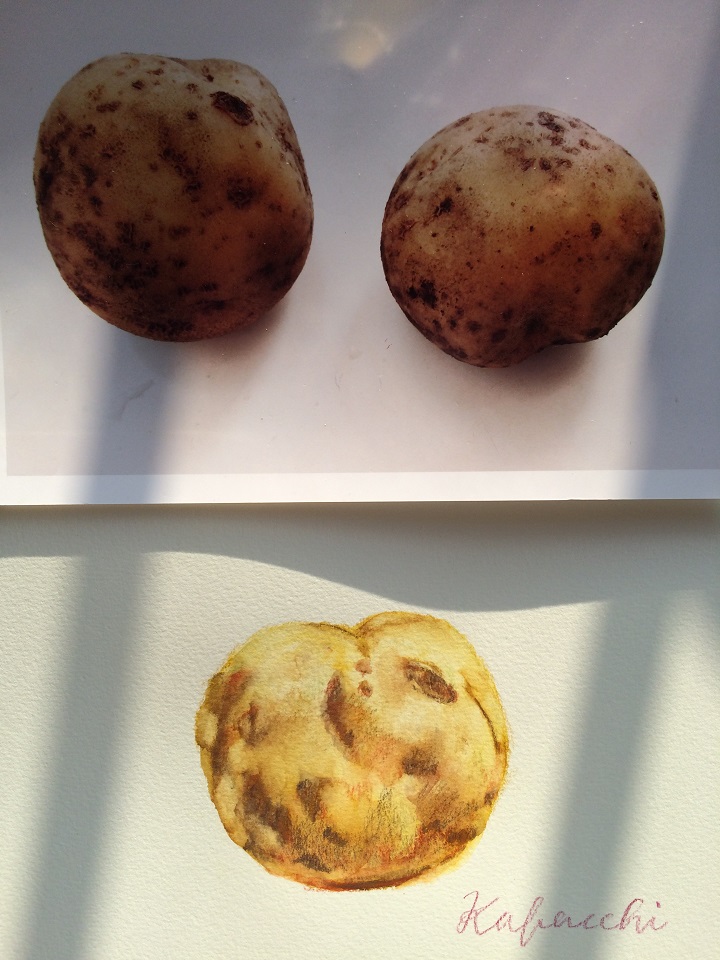 ジャガイモは小さな凹凸があって難しく自分で何を描いているんだかわからなくなってくるが、kakoさんが都度方向修正をしてくれて、だんだんそれっぽくなってくる(ような気がする)。しばらくして「完成・・・か?」くらいのテンションで完成したのだが、少し離れて見るとジャガイモに見える(笑)水彩色鉛筆はなかなか面白かったです。