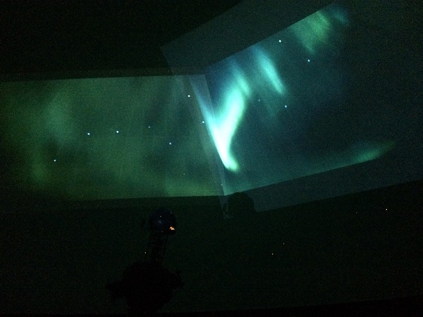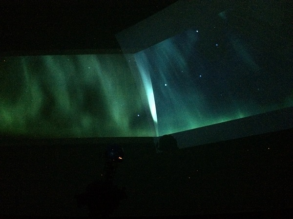 2台のパソコン、2台のプロジェクターで左用・右用に分割された映像を映すという方法でプラネタリウムドームの視界いっぱいにオーロラを映すことに成功。自分もプロジェクターを買いたくなった。買うつもりで検討を進めます(笑)