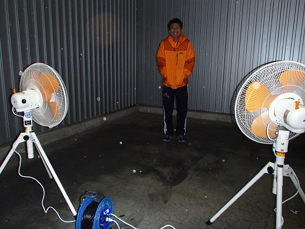 Yukon Arctic Ultra対策で某所の冷凍庫をお借りし実験をおこなった。冷凍庫の設定温度はマイナス20度、そこに空気の対流があり体感気温はマイナス25度とのこと。そこに業務用の扇風機を2台持ち込んで「強」で回すことにより体感気温マイナス30~35度くらいを経験するという狙い。