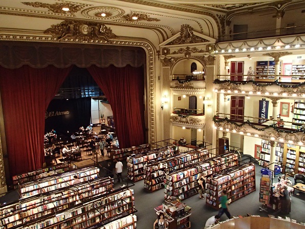 レコレータ地区の「El Ateneo」世界で2番目に美しい本屋に到着。聞いた話だと観光客が吸い込まれていくからすぐわかるとのことであったが平日のためかそんなに人は多くない。注意してこの辺のはずと歩いていたから気がついた感じ。店内は確かに美しい。本もざっと見てみたがもちろんスペイン語なのでわからず。旅行情報誌を少し見た。写真が多いものなら楽しめる。この本屋はもともとは劇場で、その後映画館になり、それから本屋になったようだ。元が劇場なのでステージがあり今はステージ上がカフェになっている。中央部は吹き抜けになっていて一番上の丸天井には絵が描かれている。天井が写真に納まりきらないので地下フロアに下りてそこから写真を撮った。2階、3階へ登ることもでき上の階にも本は並べられている。お客さんはある程度入っていてレジにも人は並んでいたが、本の点数は多くなく(しかしCDやDVDもあった)本を売るよりも美しく見せることに重点が置かれているお店かなという印象を受けた。それとも日本の大きい本屋のように膨大な量の書籍を並べるような本屋はないのかな。