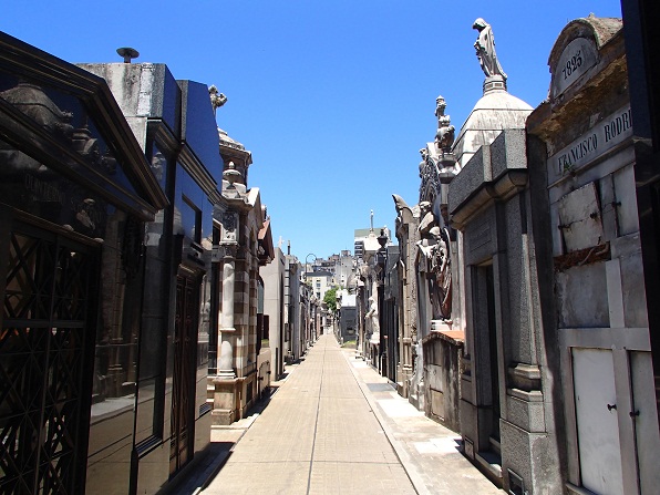 12時ごろ本屋を出てレコレータ墓地へ向かう。ショーウィンドウのマネキンの肩紐が外れて片方の胸が出ているのを見た。これはわざと?それとも事故か?20分ほどでレコレータ墓地に到着。墓地に入るとミニチュアの家のようなものが立ち並び小さな街に入ったかのようだった。広い敷地の中央部は木が植えられ広場になっていて、そこから放射状に道が伸びている。大きい道の間には何本もの細い通路もあり迷路のようだ。とても全て見て回ってはいられない。大きな道を大雑把に歩いていると美術館のような装飾を施したお墓がたくさんある。小さな家のような墓1つが一家の墓になっていて入っている人の名前や西暦(生きていた期間)が書かれている。中には今は手入れされていないのかぼろぼろになっているものもある。