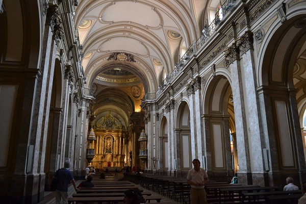 5月広場まで戻ってくると3日前に来たときに大統領府(カサ・ロサーダ)に作られていた工事の足場がなくなっている。余計な邪魔がなく全体像を見ることができてよかった。5月広場に隣接する大聖堂(カテドラル・メトロポリターナ)の中を見学する。アタカマのレースに出場した帰りにチリのサンチャゴで見学した大聖堂とほぼ同じ作りになっていて荘厳な雰囲気。この大聖堂は今でも教会として利用されているのだろうか。1ヶ所でだけ神父さんの入った箱(パーティション)に向かってお祈り?相談事?をしている男性の姿があった。