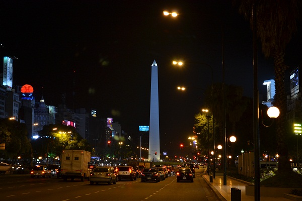 食事の後は夜景撮影をしに7月9日通りへ夜の散歩。ブエノスアイレスに来てからはいかにも観光客という姿を避けて一眼レフカメラは持ち歩いていなかったが、注意していれば危険は感じないし、夜景を綺麗に撮るならやっぱり一眼レフカメラのほうがよいのでブエノスアイレスでの初の一眼レフカメラ撮影。ブエノスアイレス最後の夜、この旅の最後の夜をゆっくりと味わった。帰りたくないなあ・・・。