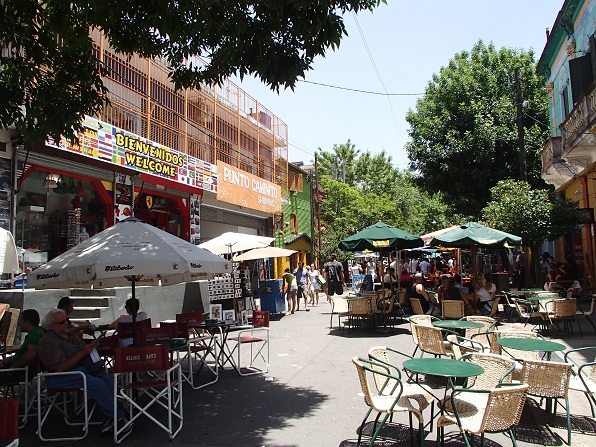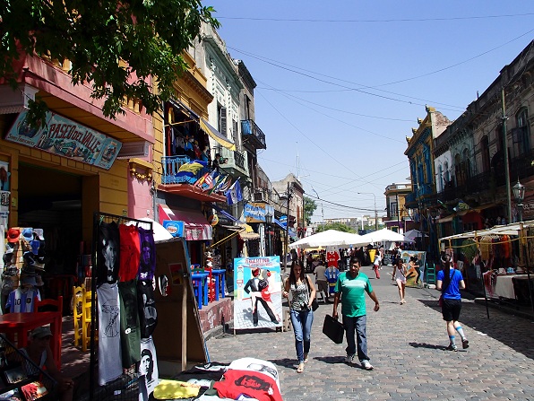 観光っぽい通りは中心から伸びる3本の道。それぞれ100mくらいかな。1本は両側にレストランが立ち並ぶ。レストランの前には小さいステージがありタンゴを踊っていたり、楽器を演奏したり、歌を歌ったりしている。どのお店を選んでも目の前でショーを見ることができる。お店に入らずに歩いているだけでも見れるけど食事するくらいで目の前でしっかり見れるなら食事していったほうがいい。1本はお土産物屋が並ぶ。いくつかお店を覗いてみたがやっぱりどうしてもこれを買いたいというものはない。あちこち旅に行っているうちに目が肥えてしまったのかな。もう1本は絵描きさんが絵を売っている静かな通り。絵が好きな人はいいかもしれない。「絵の写真は撮らないで」と張り紙あり。街はマラドーナの故郷らしくところどころにマラドーナの人形が飾ってあったりする。