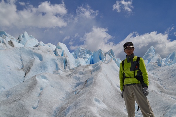 アイゼンをしっかりと付けてもらい。氷河の上に足を踏み出します。岩と土の地面から白い場所に踏み出したときは、最初は岩の上に雪か氷があって少しずつ完全な氷になっていくのかと思いましたが、いきなり岩から氷に変わりました。表面は雪のように見えていますが完全に氷です。南極では氷の上にしっかり雪があったためアイゼンは不要でしたが、ペリトモレノ氷河はしっかり氷のため確かにアイゼンが必要です。氷河の上は踏み後をたどって1列で歩きます。歩く間はポケットに手を入れたりしないこと、立ち止まって写真を撮ったりしないことを注意されました。歩くときは滑ったり滑落したりしないように歩くことに集中しますが、ときどきまとまった人数が立ち止まれる場所で止まって写真撮影タイムがあります。氷河の裂け目は青く輝き、場所によっては氷河が解けて流れ出した水が川となり氷河に深い穴を作って滝のように流れ落ちています。青い氷河(ブルーアイス)は南極でもたくさん見たが、氷の塊が波長の短い光を強く反射するから青く見えるとか理屈でわかってもなお不思議な色を出している。