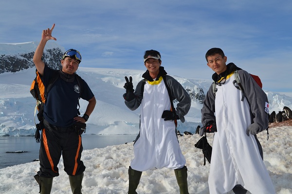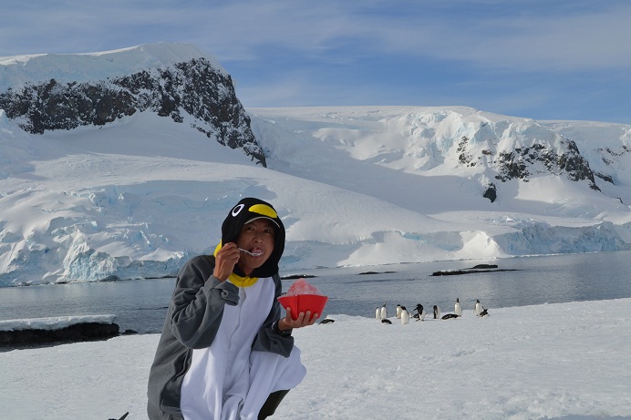 レースがあってもいいように準備をしていたのですぐに行動可能。レース用のザックは部屋に置いて防水バッグにペンギンの着ぐるみとかき氷のシロップを入れて出発。上陸地はミケルセン・ハーバーというところでジェンツーペンギンという種類がいるようだ。ペンギンのコロニーになっている場所は直径500mもないくらいの小さな島になっていて南極半島本体ではない。上陸するなりペンギンだらけ。島には木の小屋が建っていてアルゼンチンの国旗が描かれている。この島はペンギン観賞用の観光スポットとして管理されているのだろうか?ペンギンに着替えてスノーシューを装着。上陸したら自由時間のようで2~3時間は勝手にぶらぶらしていていいらしい。日差しは強くロングスリーブの上に薄いフリースのペンギンで全く寒くない。気温は10℃はあるのではないかと思う。ひろっちと武石さんもペンギンでうろうろしているので3人揃って写真を撮ったりして遊ぶ。外国人選手にもペンギンの着ぐるみは人気で一緒に写真を撮ろうと言われることも多い。外国人選手はおかしなことをして遊ぶのは好きなのに意外とこのようなお遊びグッズは持ってきていなかった。