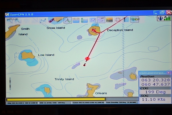 (写真1)デセプション島に上陸できず、さらに南へ向かう。