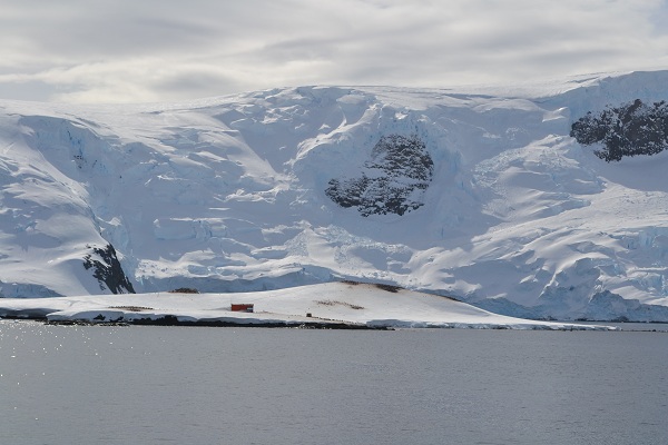 海を見るとペンギンの群れが船と並走して泳ぎジャンプを繰り返している。デセプション島の湾から出て行くときには巨大な岩壁の間近を通過。南極は夏を迎えているといっても夏の始まりのため事前にネットで調べた感じよりも雪が多く真っ白な世界。しかし岩壁が垂直近くに切り立っているところは雪がついてなく波風に削られた荒々しい地形を見ることができる。