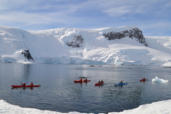 すると今日はレースはおこなわず、これからペンギンのコロニーに上陸するという。RacingThePlanetの選手たちと観光者と共通のアクティビティでスノーシューかシーカヤックを選びガイドについて行くようになった。正直なところレースがおこなわれずにほっとした。自分の中で競技者の要素がだいぶ薄くなっているなと感じる。私はペンギンの着ぐるみを使う機会を伺っていたのと南極の氷でかき氷もしたかったためスノーシューを選択。他の日本人メンバーもみんなスノーシュー。レースに参加している人はほとんどスノーシューを選択していたと思う。シーカヤックは艇数も限られているためあまり大勢が希望してもできそうにない。