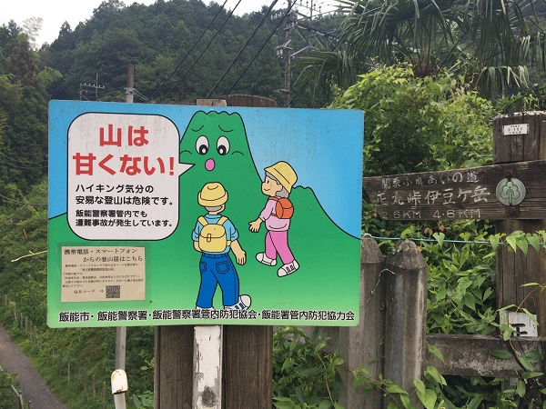 東に向かって尾根を走る。この辺は登山道の案内標識もなく一般ハイカーはあまり通らないようだった。17時30分、522mのピークでヘッドライトを点灯。それから少し走ると舗装路に出た。このコースは何度か舗装路に出るが尾根を東へということに変わりはないため、道路を横断した先に登山道の入口を探すが見当たらない。尾根の入口だけ少し踏み跡のようにも見えたので入ってみるが、藪っぽくて明らかに道ではない。一度舗装路に戻ると、小さな看板があり北のほうに向かって「吾野駅舗装路進む」と書いてある。道路の右手にトレイルの入口がないか気を付けながら進み、見つからなければそのまま降りて吾野駅から電車で帰ればいいかと思って舗装路を下り始める。