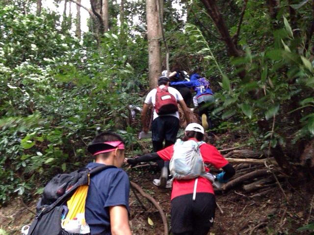 そんな中向かいからトレイルランナーの一団が走ってきて「こんにちは!こんにちは!」と声をかけながら、両腕を広げて華麗にバランスを取りながら駆け下っていきました。「こんにちは!」って連呼すればいいってもんじゃないだろうと思いましたが、せっかく講習中なので悪い見本としてご紹介させていただきました。すれ違い・追い抜きの際は歩いたほうがよいです。