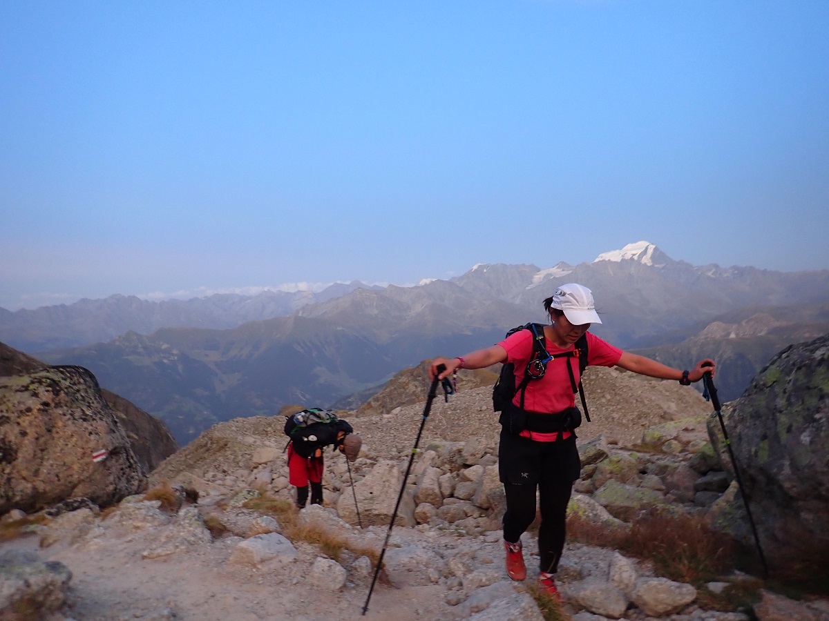 Cabane de Velanから登って稜線を超えて山の反対側に降りるコースですが、出だしから岩がごろごろで道がわからない。反対側に降り始めてからが難しいのに稜線に着くまでで前後のチームとは完全に分かれてしまい、けっきょく核心部は自分たちだけで進まなければいけませんでした。昼間だとかなり印象が違うと思いますが夜だとどこを歩けばよいかまったくわからず、コースにはケルン(といっても石3つ4つのミニケルン)があるのでそれを探して進みます。しかも2人同時に動くと次のケルンが見つからないときにどこから来たのかわからなくなってしまうので、ポーリンが前でケルンを見つけるまでは私が1つ手前のケルンで待機し、GPSを見てポーリンの方角がずれてきたら「もう少し右だと思う」とか声やライトで伝えて進むという感じでパズルのようでした。